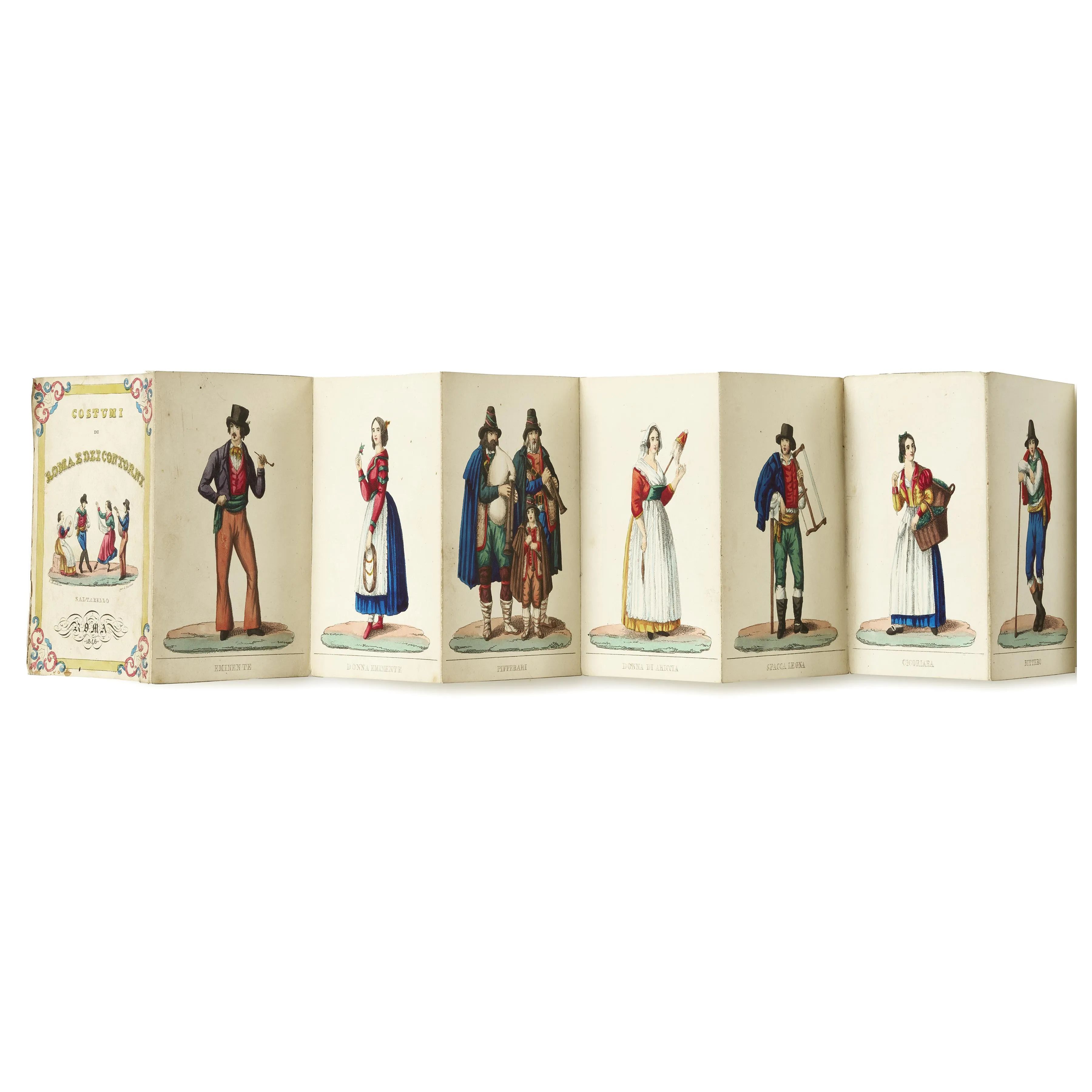 In dodicesimo (110 x 80 mm). Album a leporello con frontespizio figurato, 30 costumi incisi da V. Mochetti e finemente colorati a mano. Legatura editorial in cartoncino nero con custodia.