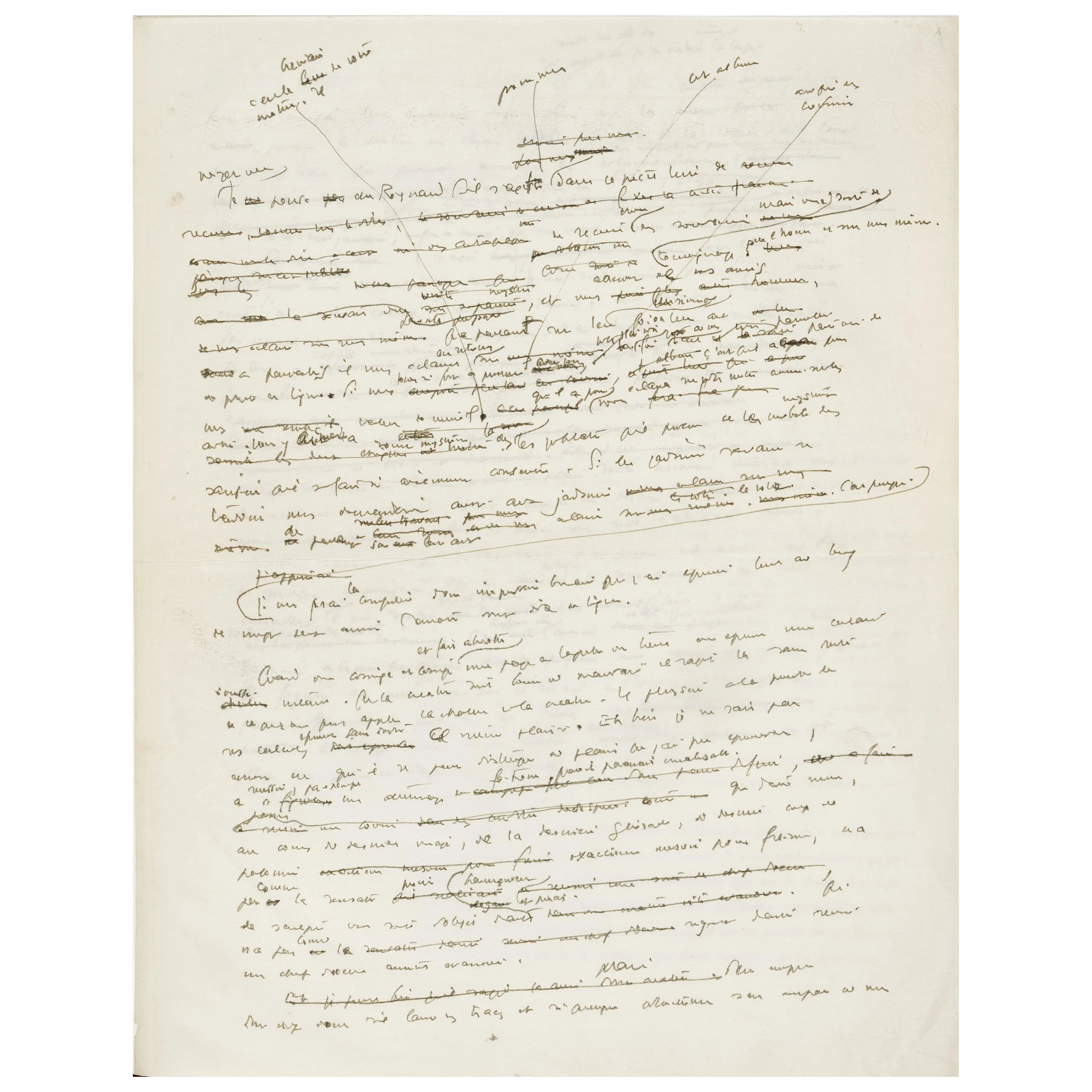 De Saint-Exupéry, Antoine. Manoscritto autografo probabilmente indirizzato a Paul Reynaud, sul lavoro del pilota, circa 1943-44, 2 pagine in quarto montate su linguette, entro legatura in mezzo marocchino rosso con angoli e titolo in oro al dorso. Scrittura molto densa, con numerose cancellature e passaggi barrati, che delinea un paragone poetico tra la creazione artistica e l'arte del volo: ‘Je vous ferai la confidence de cette impression bizarre que j'ai éprouvée tout au long de mes vingt-trois années d'aviation, dont dix de lignes. Quand, on corrige et corrige et fait aboutir une page à laquelle on tient, on éprouve une ivresse intérieure... en quoi ce plaisir se peut distinguer du plaisir que j'ai pu éprouver à réussir tel atterrissage de fortune quand il paraissait irréalisable? De Saint-Exupéry si chiede chi non abbia mai provato il vago rimpianto di essere riuscito a realizzare un capolavoro svanito subito dopo. E continua: ‘l'art de la danse ne laisse point de traces qui puissent enrichir les collections, et cependant une civilisation peut reposer sur la qualité de ses danseurs... chaque courrier est une création aussi bien que chaque poème. On dit style d'un poème et style d'un vol’.
