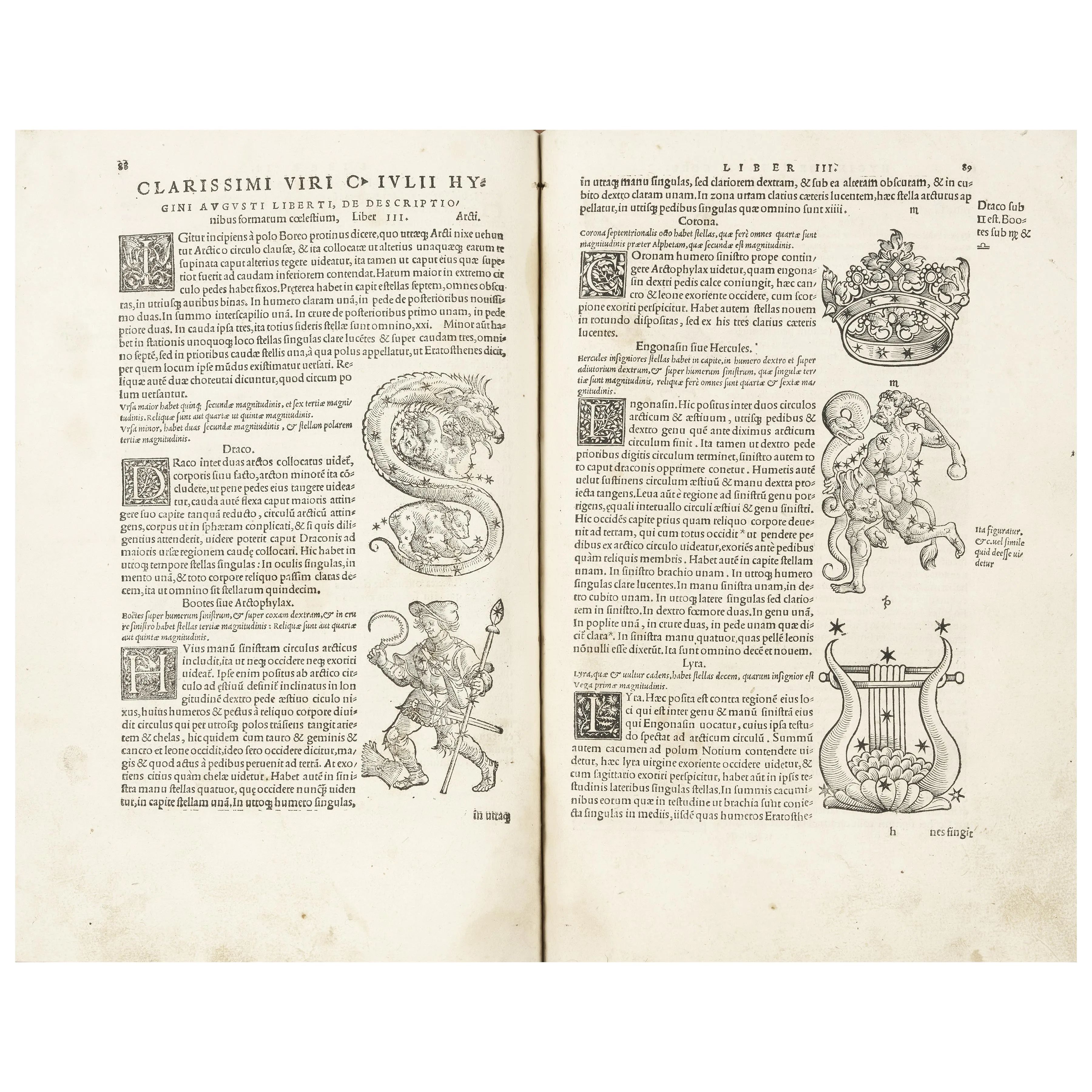 Compilata da fonti greche, l’opera registra circa 300 leggende mitologiche e genealogie celesti, accompagnate da raffinate xilografie raffiguranti le figure dello Zodiaco, sole, luna, pianeti. Testo prezioso anche come testimone di opere di tragediografi greci oggi perdute. La presente è la prima di tre edizioni di Hervagius, stampate da un manoscritto del IX o X secolo.