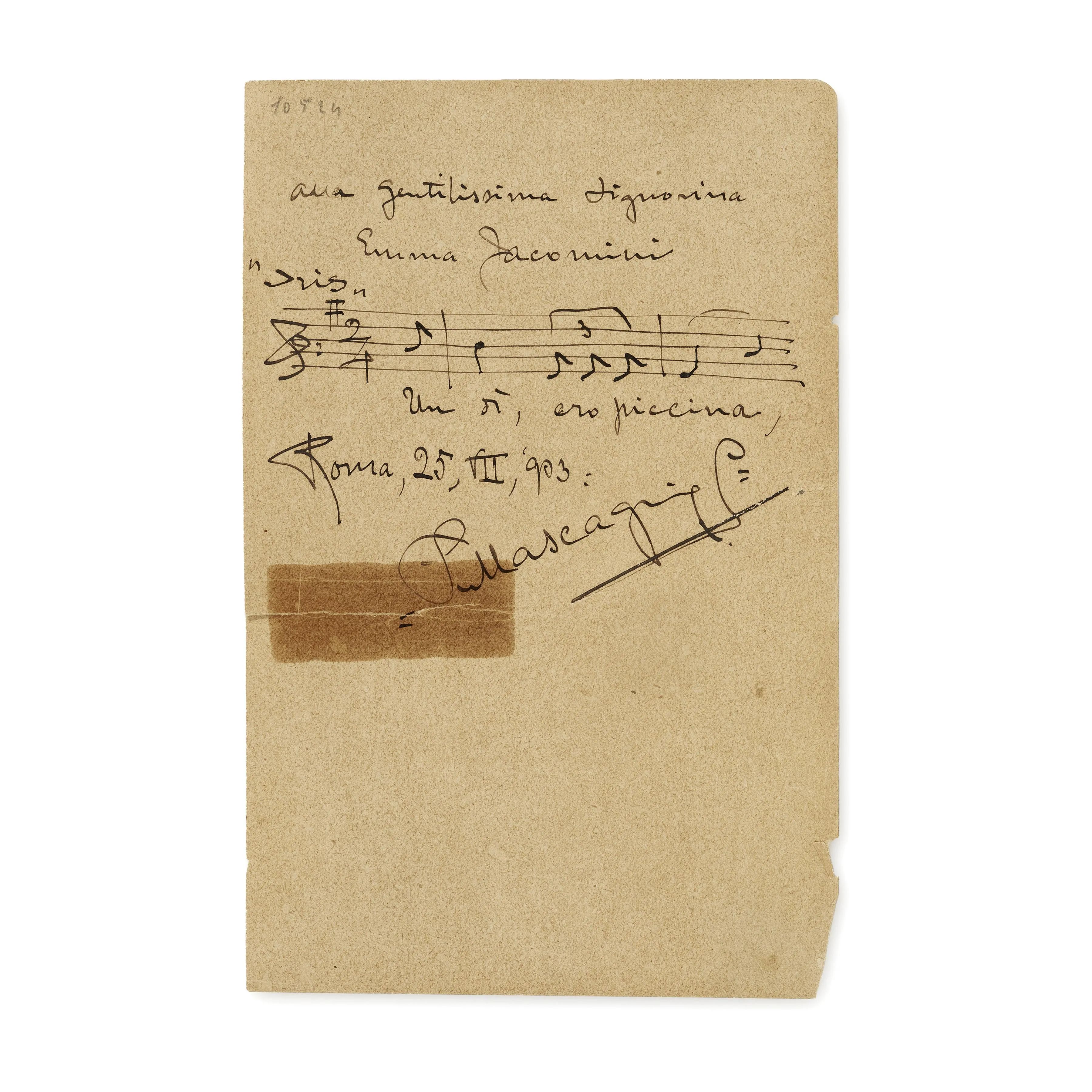 Mascagni, Pietro. Pagina di album amicorum con dedica e citazione musicale di tre battute autografe firmate, datate ‘Roma, 25, VII, 903’ e il testo dell’aria ‘Un di, ero piccina’.