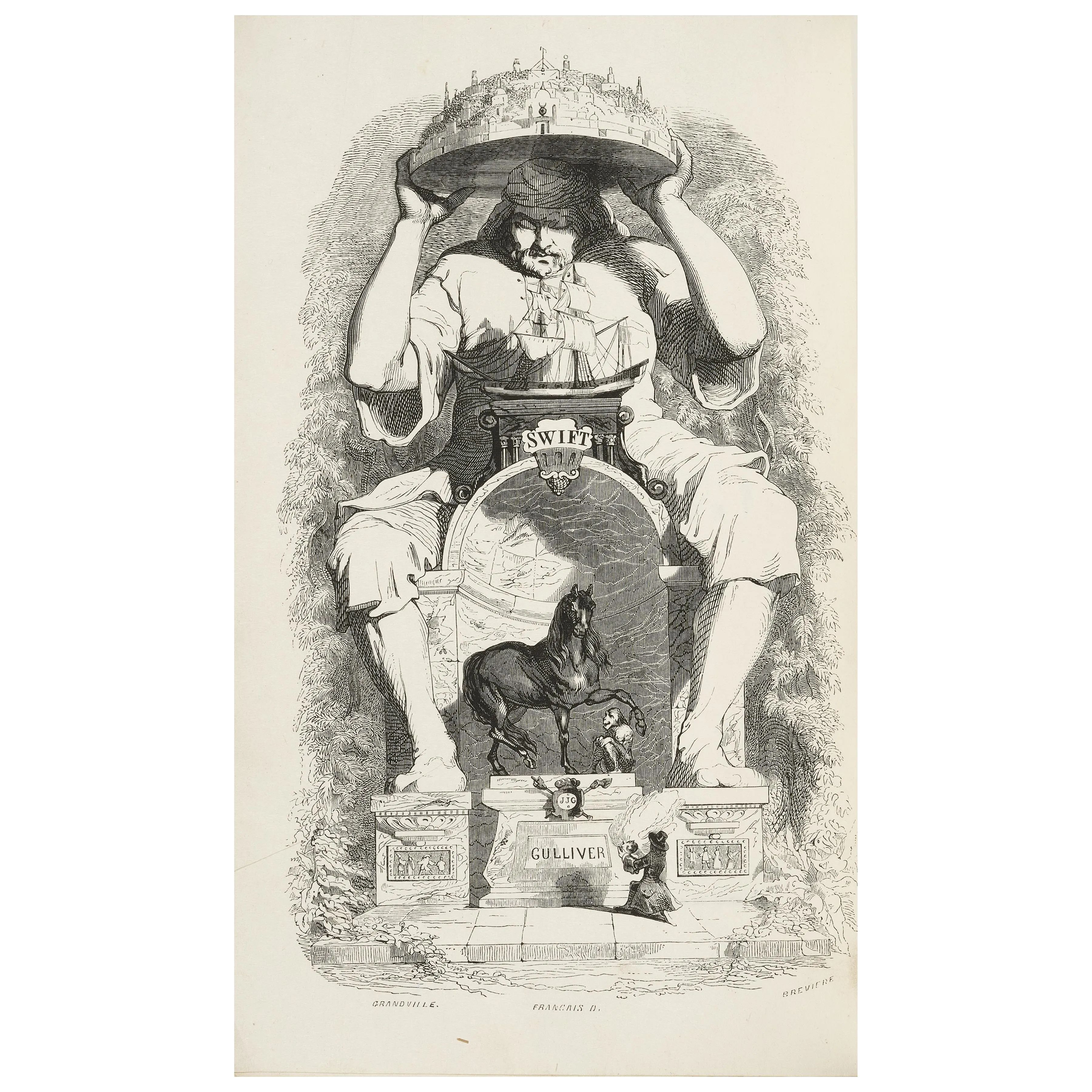 Lotto composto dai due volumi della prima edizione dei Voyages de Gulliver dans des contrées lointaines stampata a Parigi nel 1838 e da una bella copia di Un autre monde in edizione originale del 1844 con centinaia di tavole, delle quali 36° pina pagina. Il gruppo di opere comprende anche la seconda edizione del Gulliver di Johnatan Swift, i celebri 100 Proverbes con 51 tavole a piena pagina, l’edizione stampata da Fournier nel 1846 delle Petites misères de la vie humaine, la prima edizione de Les fleurs animées, la prima edizione di Les Etoiles con 15 incisioni a colori, Florian traduit par Grandville del 1849, la Vie privée et publique des animaux del 1868 ed infine Les métamorphoses du jour del 1869, tutti riccamente illustrati dal uno dei più grandi artisti francesi del XIX secolo.