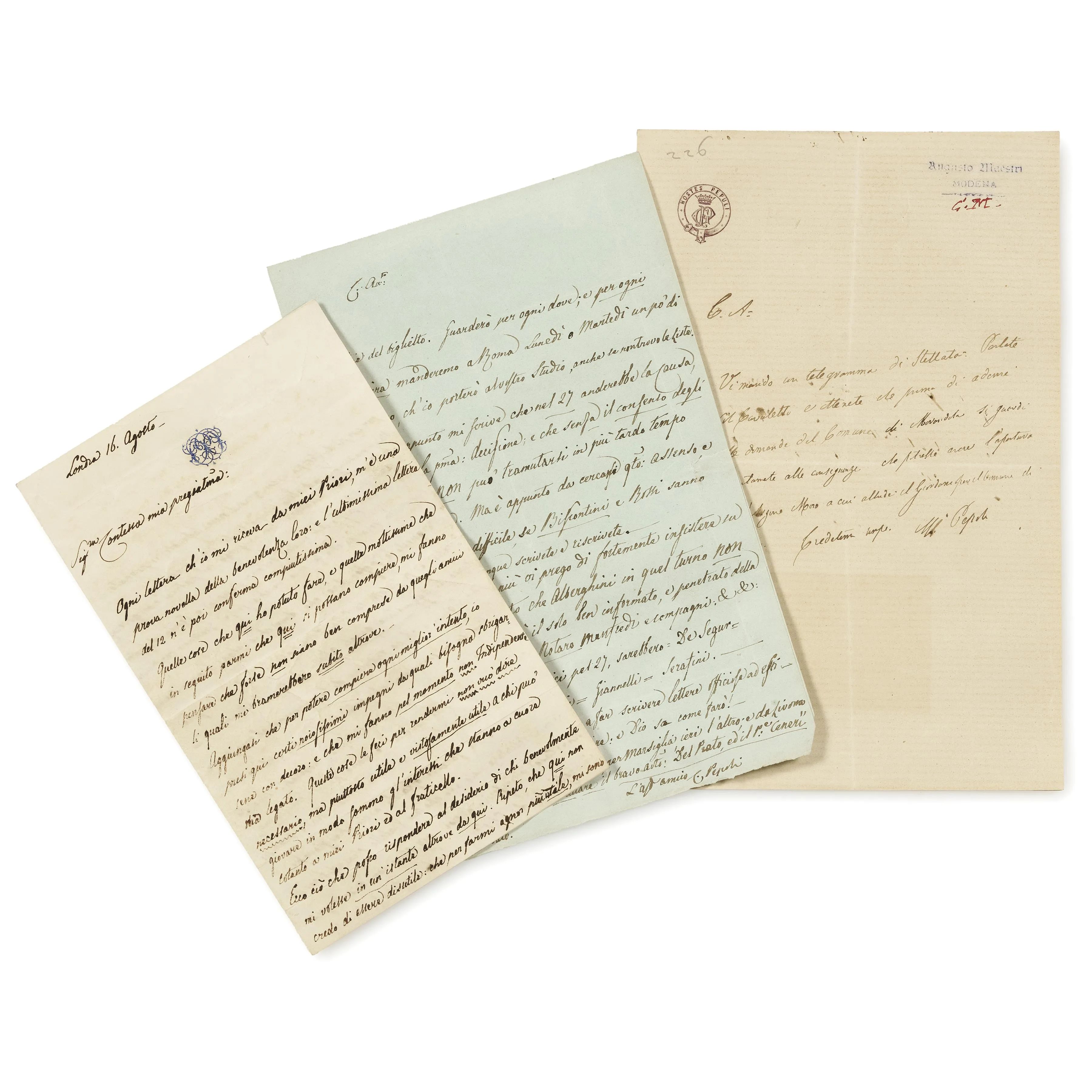 Pepoli, Carlo. Gruppo di tre lettere autografe firmate, in totale cinque pagine in ottavo, due indirizzate all’avvocato Del Prato e riguardanti una causa a Londra, e una indirizzata ad una ‘Sig.ra Contessa mia pregiatissima.’ Quest’ultima è particolarmente significativa: ‘In quanto all’accettare un impegno in patria non governativo… bramo servire l’Italia, se puossi la città dove nacqui’. Bell’insieme.