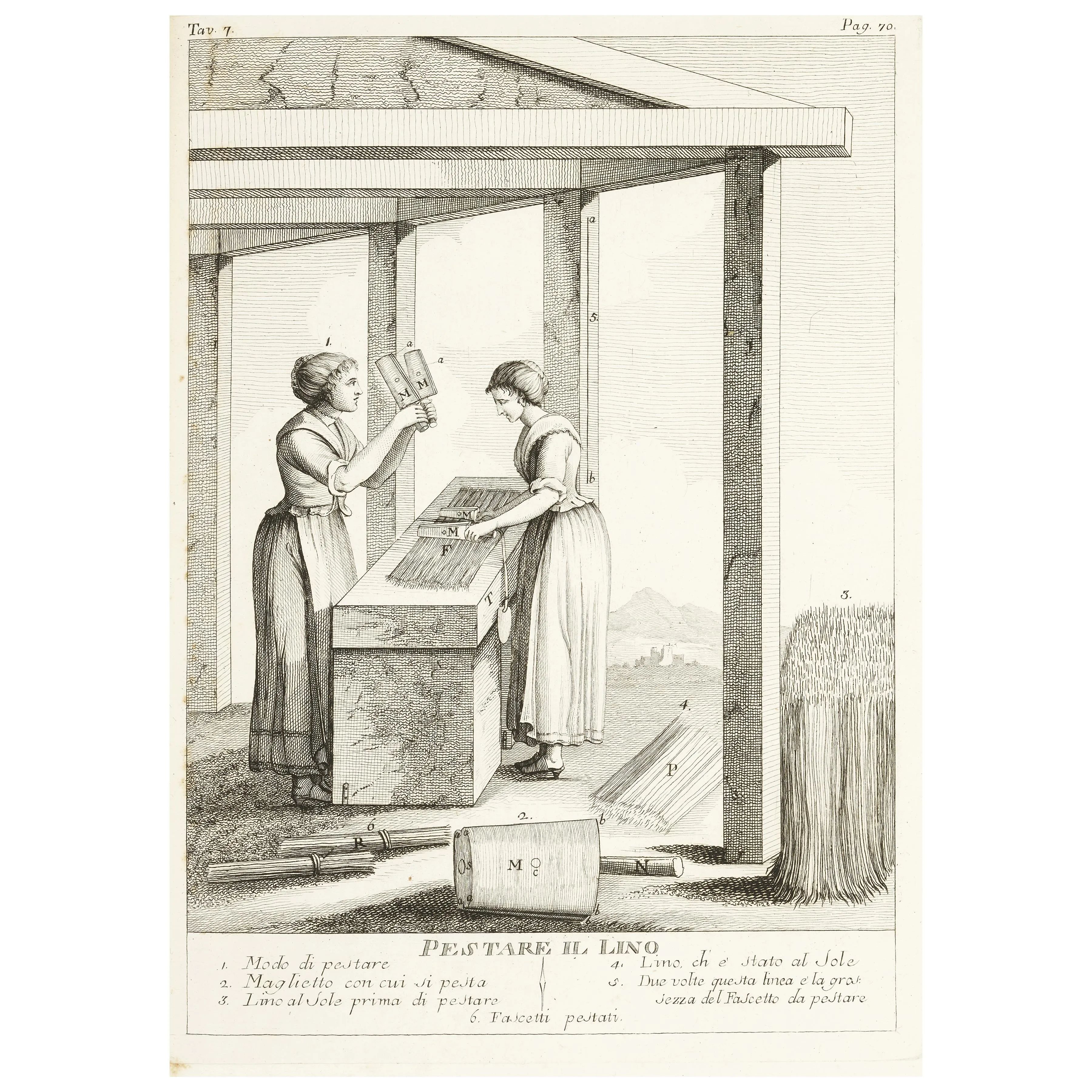 Ottimo esemplare della prima edizione di quest'opera sulla coltivazione e la lavorazione del lino, con le tavole che raffigurano la semina, la raccolta, la macerazione, la lavorazione del lino, gli attrezzi.