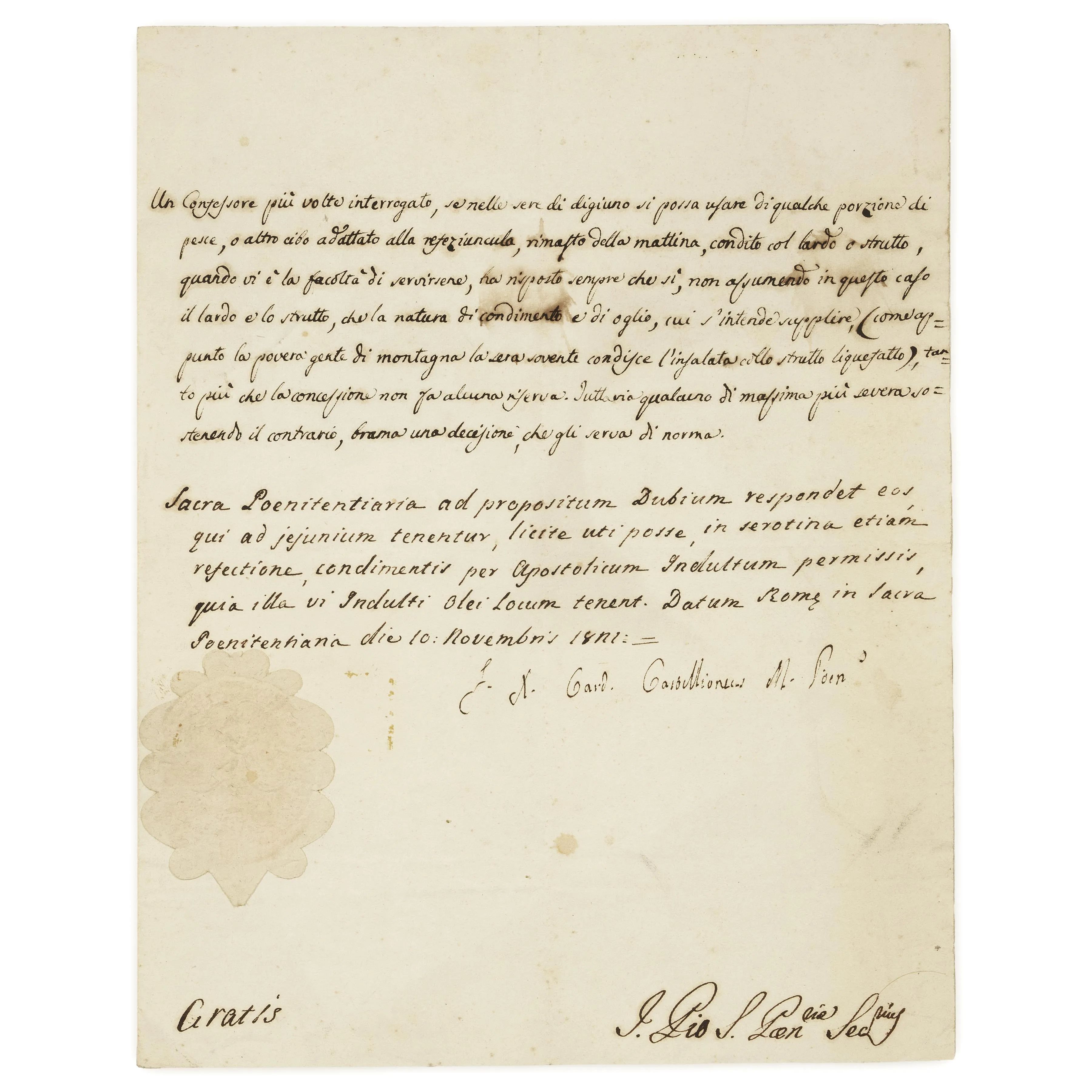 Pio VIII. Lettera con firma autografa di Francesco Saverio Maria Felice Castiglioni quando, su nomina di papa Pio VII, egli era Penitenziere Maggiore, il più antico dicastero della Curia romana, una pagina in quarto, ‘Datum Romae in Sacra Poenitentiaria die 10: Novembris 1822’. Nel documento si parla di gastronomia, soprattutto dell’uso di lardo e strutto nei giorni di magro ovvero di digiuno.