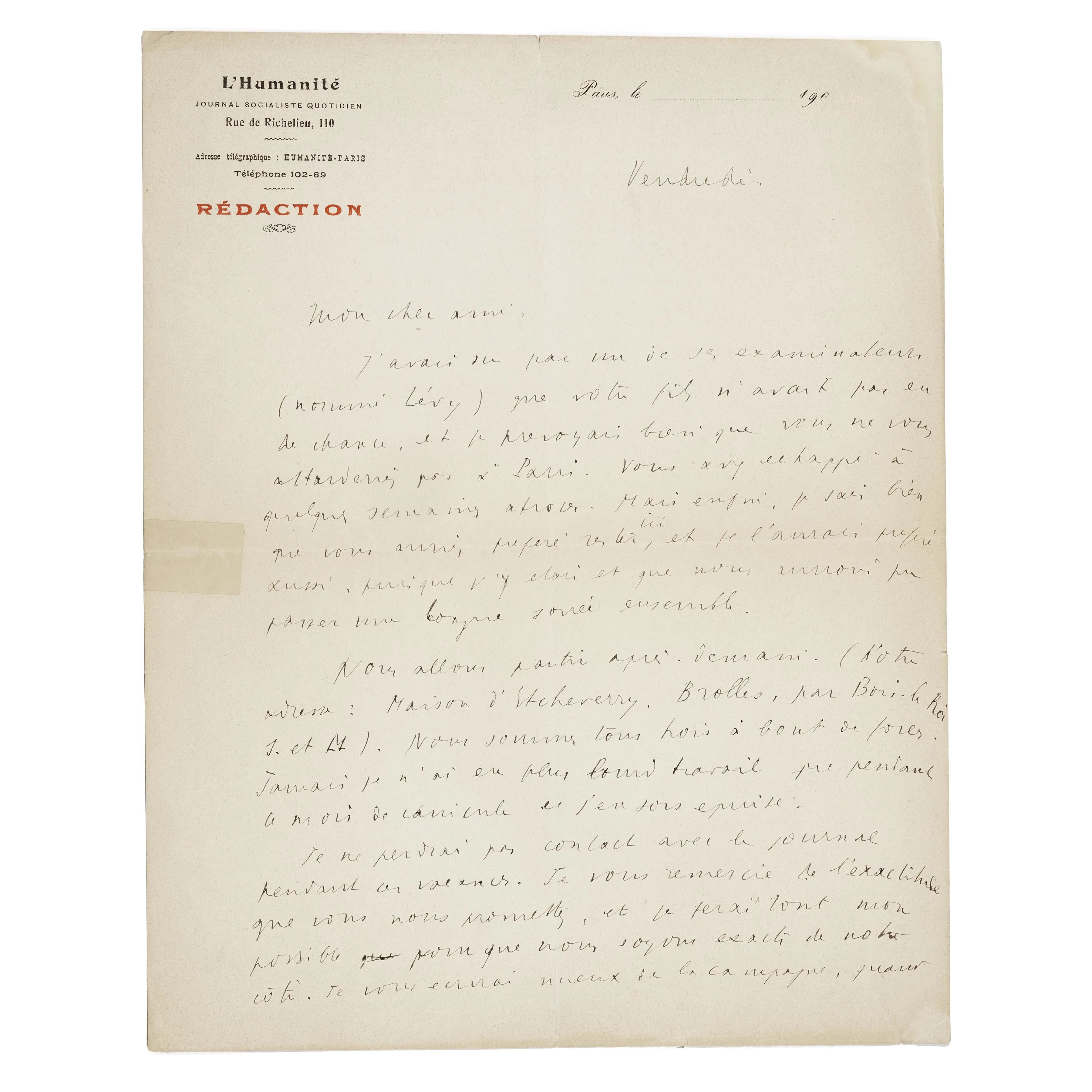 Blum, Léon. Lettera autografa firmata, due pagine in quarto su carta intestata della redazione del giornale socialista L’Humanité, datata solo ‘Vendredì’ ed indirizzata a ‘Mon cher ami’ che sappiamo essere Georges Lecomte in quanto lo scrivente saluta la moglie alla fine dell’amica missiva.