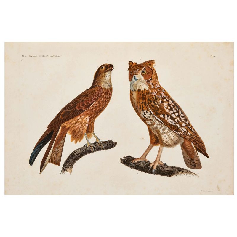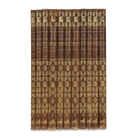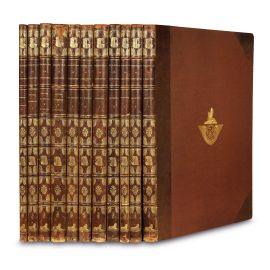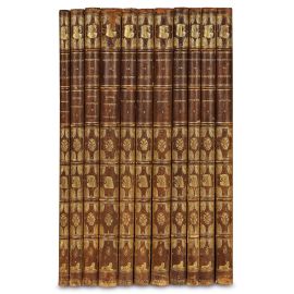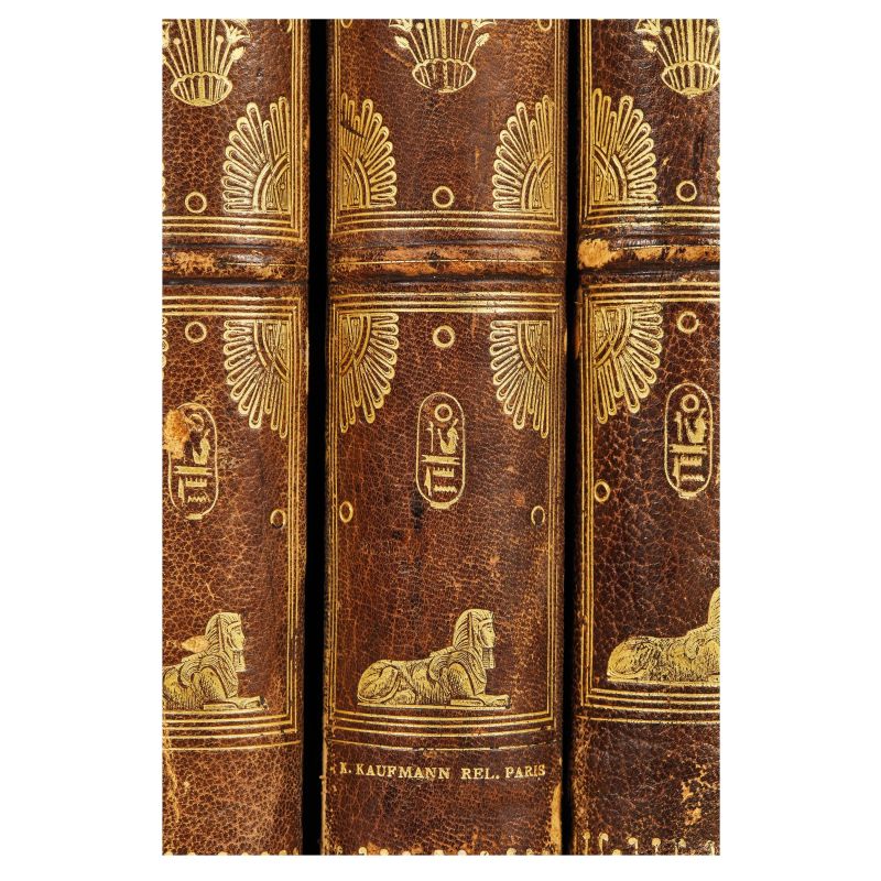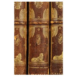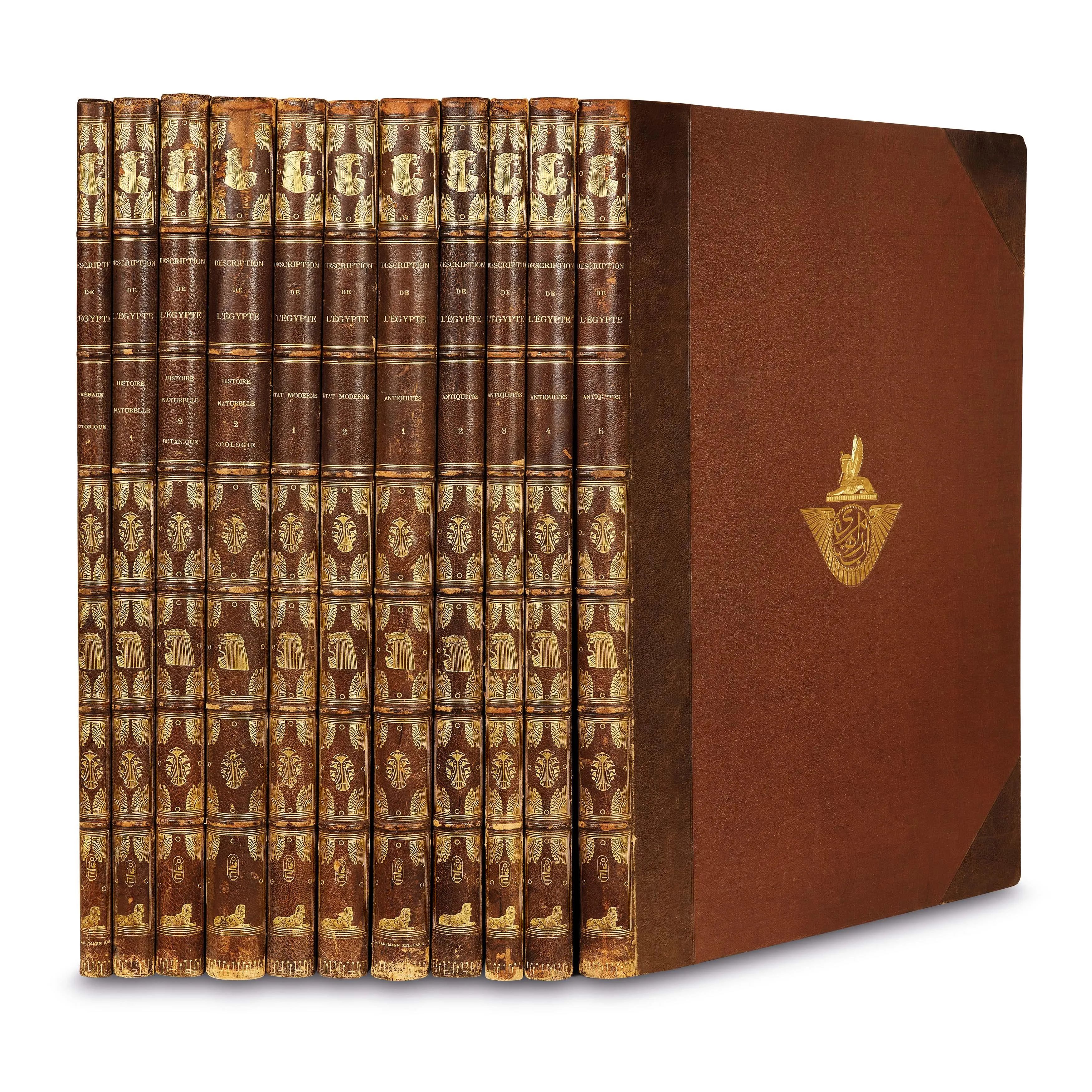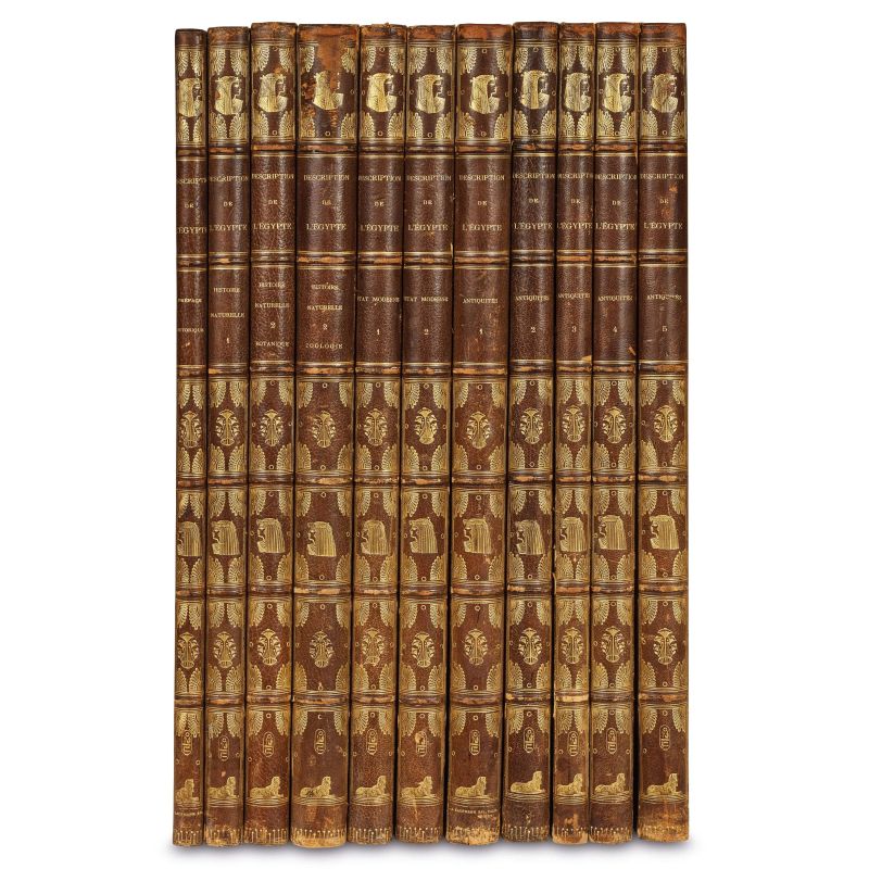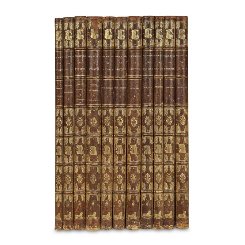 In quarto (219 x 131 mm) e in folio Jesus (687 x 516 mm). 26 volumi di testo della seconda edizione, 1 solo volume della Preface in quarto, 1 volume della Preface historique e 10 volumi di tavole della prima edizione. Centinaia di tavole su carta forte con le 14 tavole di uccelli e le 15 di mineralogia colorate “au pinceau”, caratteristica degli esemplari in “grand papier” (manca il volume delle carte geografiche e 107 tavole, bruniture e fioriture sparse, piccoli marginali strappi, altri difetti minori.) Legatura dei volumi in quarto in mezza pelle marrone con tasselli verdi per titolo e numerazione dei volumi; legatura dei volumi in formato Jesus in mezzo marocchino testa di moro con angoli e decorazioni di ferri dorati firmata “K Kaufmann Rel. Paris”, dorsi a 5 e 6 nervi, sui compartimenti decorazioni di gusto egizio con cartigli, teste e fiori, sui piatti supralibros calligrafico in arabo che reca il nome Ibrahim entro cerchio circondato da ali stilizzate e sormontato da sfinge alata (qualche spellatura sui nervi, piccole mancanze e alcuni difetti).