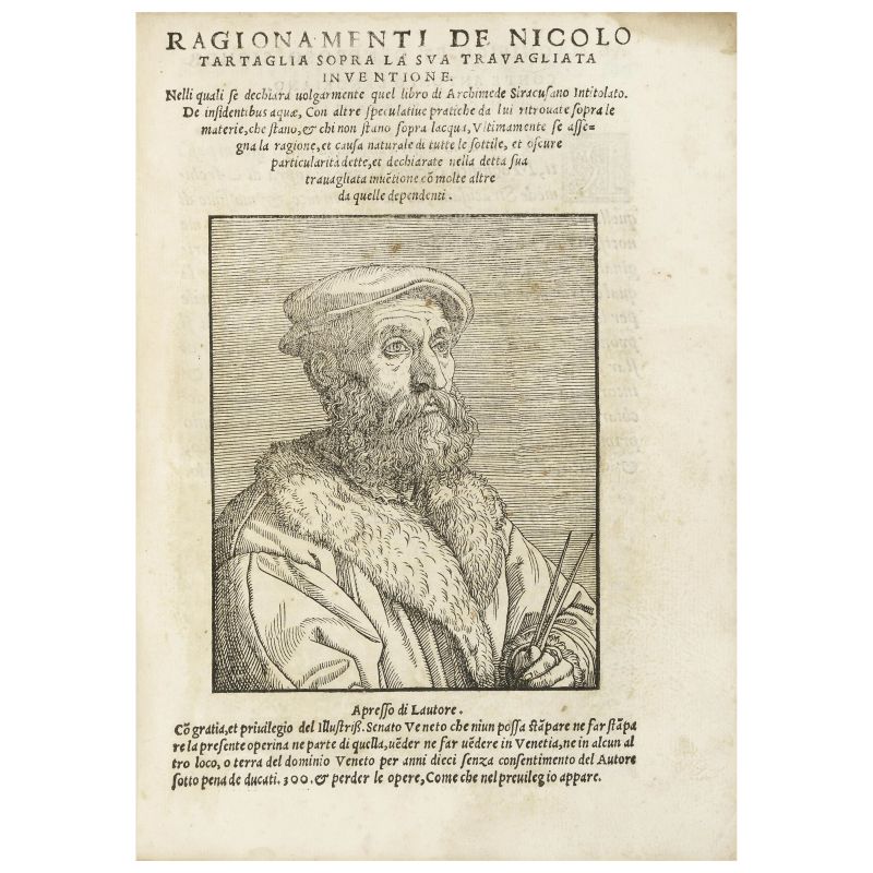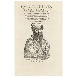 Tartaglia, Nicolò. Rara raccolta di opere del celebre matematico ed ingegnere composta da la Nova Scientia del 1550, dai Quesiti et inventioni diverse... di novo restampati con una gionta al sesto libro, nella quale si mostra duoi modi di redur una Città inespugnabile del 1554, e tre opere del 1551 ovvero i Ragionamenti de Nicolo Tartaglia sopra la sua travagliata inventione, il Supplemento de la travagliata inventione ed infine la Regola generale da sulevare con ragione e misura non solamente ogni affondata nave. La miscellanea inizia con la sua prima opera, qui in seconda edizione, che si occupa di agrimensura, ingegneria, fortificazioni e, più che altro, della “nuova scientia”, ossia di balistica, che ebbe infatti inizio con Tartaglia. La seconda opera è particolarmente pregiata per il nono libro in cui è descritta la più importante scoperta matematica del Tartaglia, la risoluzione algebrica dell'equazione cubica; si occupa, inoltre, di artiglieria, fortificazioni, topografia ed altri argomenti scientifici; questa seconda edizione ha, rispetto alla prima del 1546, un'aggiunta nel sesto libro. Le tre altre opere sono in prima edizione e difficilmente si trovano assieme. Vi viene descritto un procedimento per riportare a galla le navi affondate e vi si trovano diverse cose notevoli su argomenti di tecnica (come gli scafandri), di meteorologia (previsioni atmosferiche) e di fisica (pesi specifici).