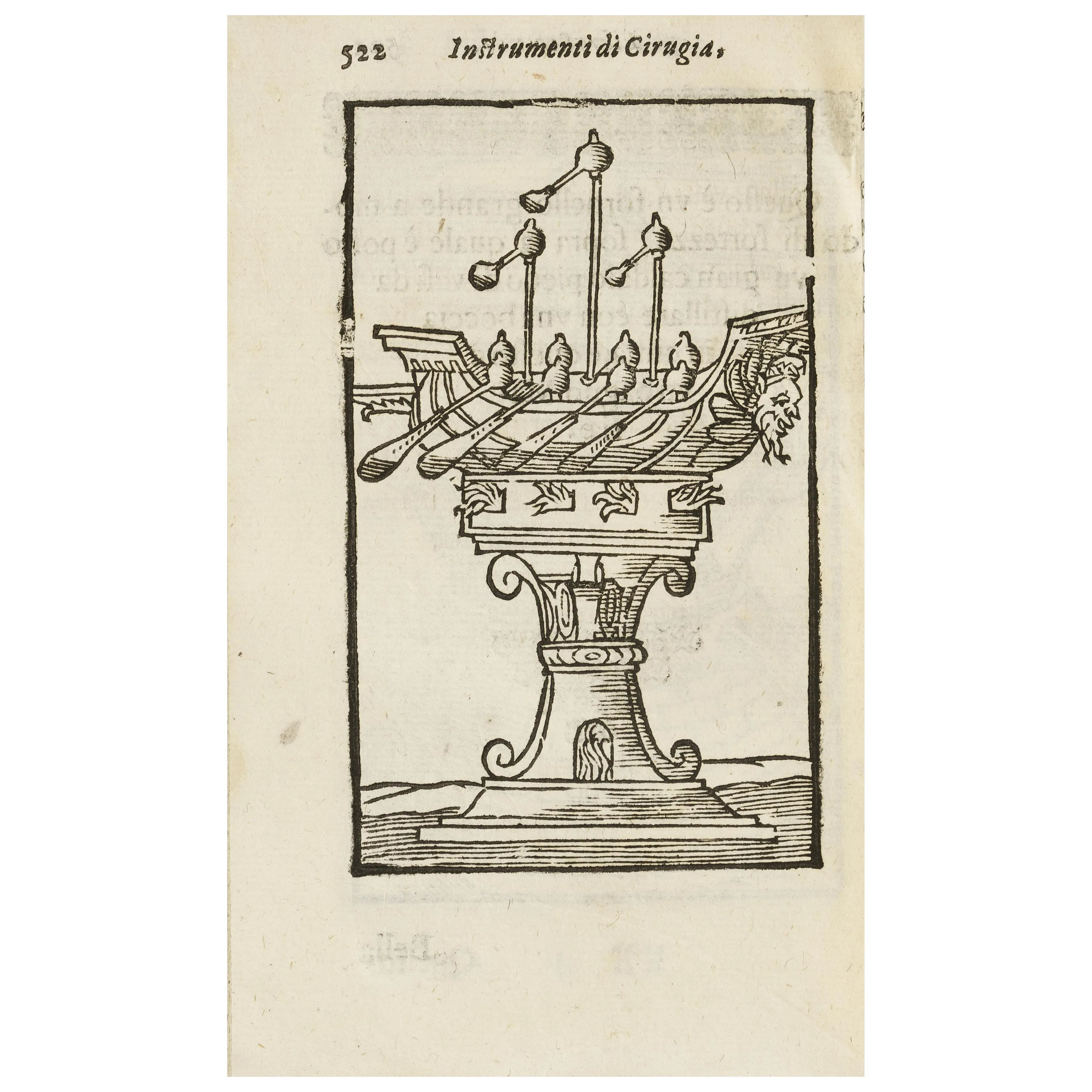 In ottavo (155 x 100 mm); [32], 565, [3 bianche]; [16], 86 pagine. Due frontespizi, 73 xilografie a piena pagina raffiguranti strumenti chirurgici e alambicchi (macchie su una decina di carte.) Legatura moderna in pergamena antica.
