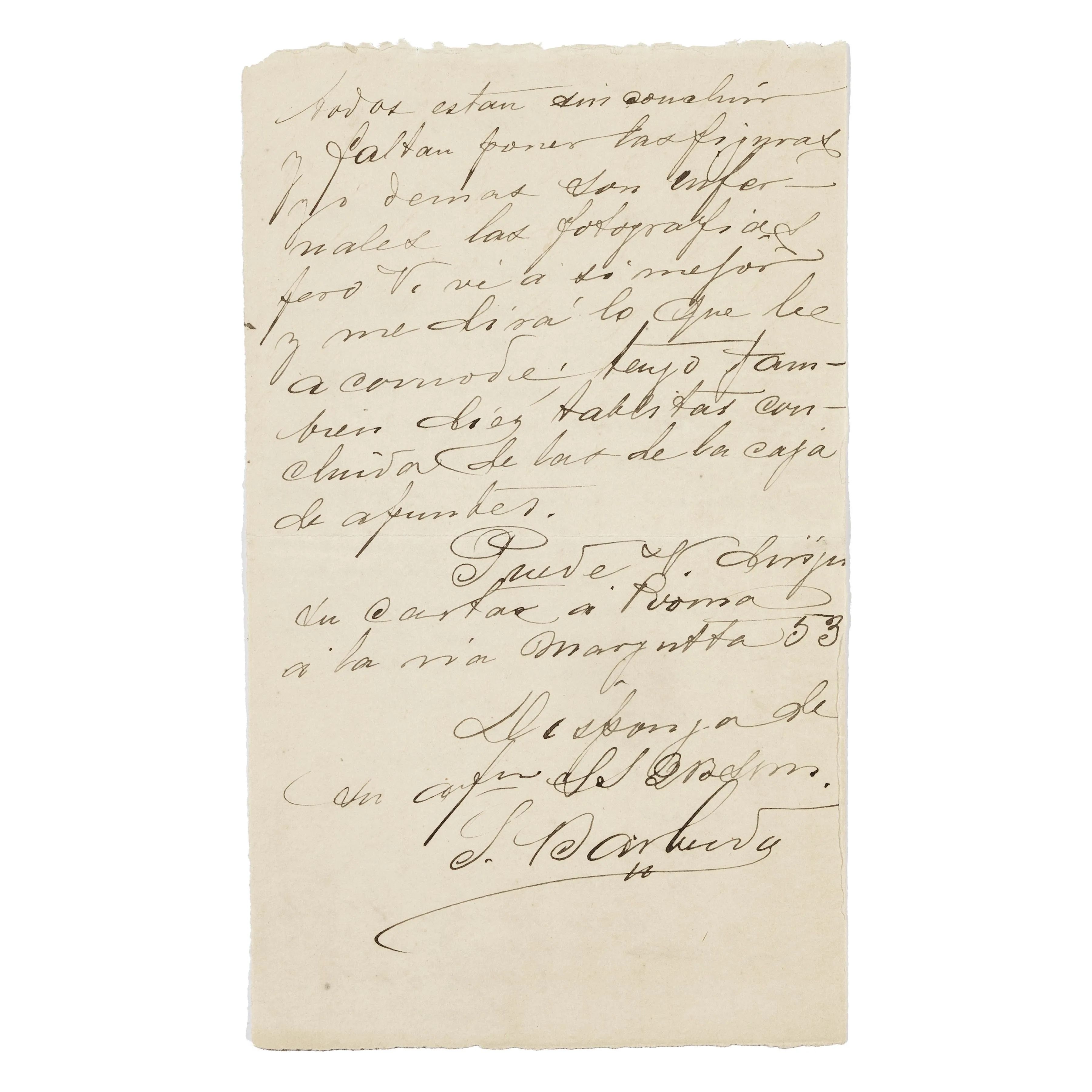 Barbudo, Salvador Sánchez. Lettera autografa firmata, due pagine in ottavo, da ‘Venezia 22 Ocbre 1888’ in spagnolo. Indirizzata ad Ernest Gambart al quale racconta del suo viaggio a Firenze e Roma e gli invia fotografie dei suoi dipinti a Venezia.