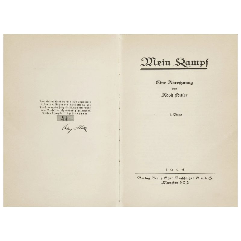 Esemplari 44 della rara Prachtausgabe, tirata in soli 500 esemplari numerati, entrambi recanti la firma autografa di Adolf Hitler. Prima edizione di uno dei testi più noti e controversi del XX secolo, divenuto manifesto ideologico del nazionalsocialismo e documento fondamentale per comprendere l’ascesa politica del suo autore. Printing and the Mind of Man 415: “Although it contained much that was shocking to many Germans, its main sentiments were widely shared in central Europe. A pseudo-mystic racial theory, totally unrelated to fact, was made to support pan-Germanism, anti-Semitism, militarism and ultra-nationalism, the combination of which was to be implemented by the unrestricted use of power as interpreted through the mentality of a superstitious bully.”