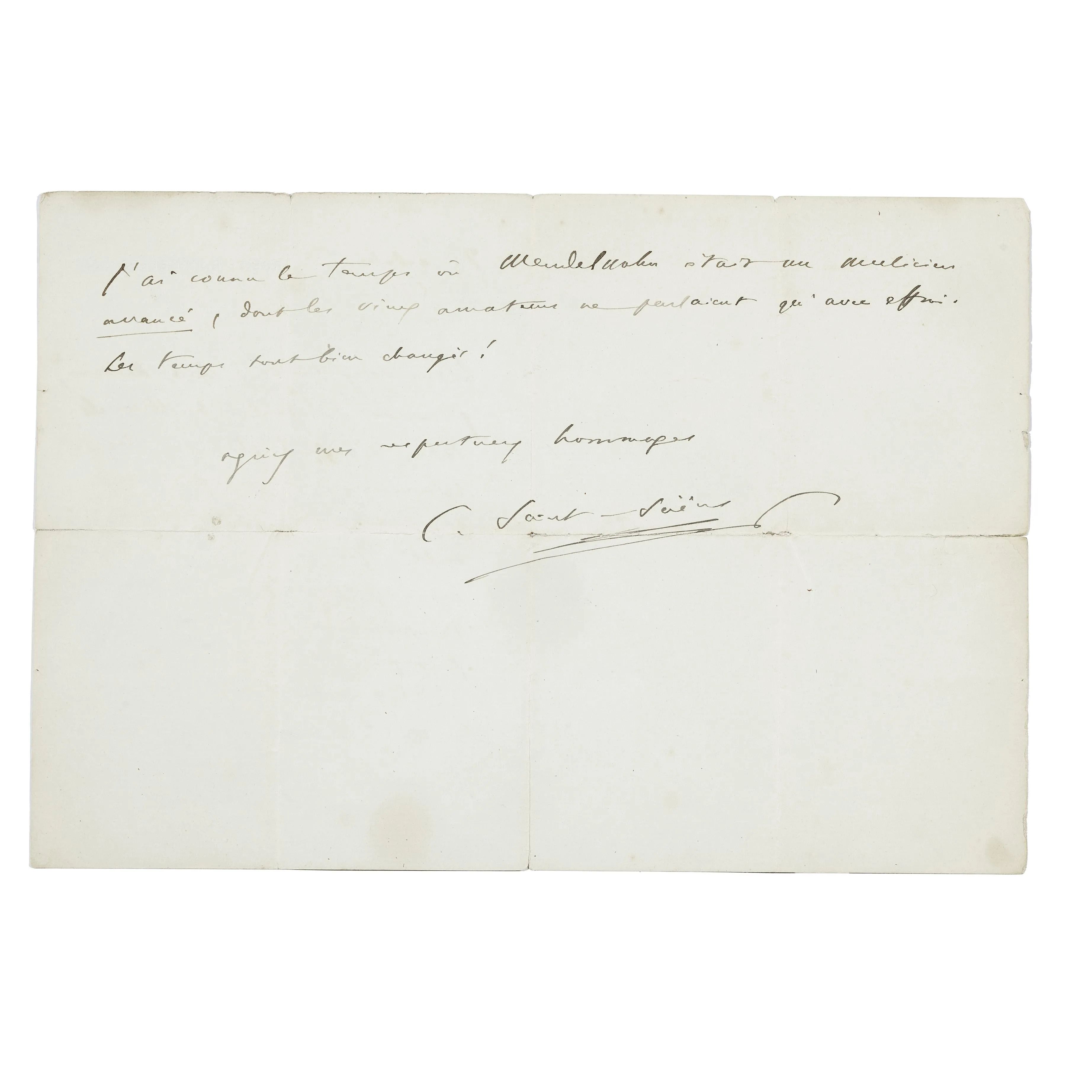 Saint-Saens, Camille. Lettera autografa firmata, due pagine in ottavo, su carta intestata con l’indirizzo di ‘Rue de Courcelles 83bis’ e datata ‘25 octobre 1914’. Saint-Saens scrive: ‘Vous avez raison, chère Madame, j’aurais dû parler de Mendelssohn, d’autant plus que les wagnériens lui ont fait une guerre acharnée’, ne ricorda le composizioni come l’oratorio “Elia”, Il “Sogno d’una notte di mezza estate”, la “Sinfonia scozzese”… e continua: ‘J’ai connu le temps ou Mendelssohn était un musicien avancé, dont les vieux amateurs ne parlait pas qu’avec affection. Les temps ont bien changé.’