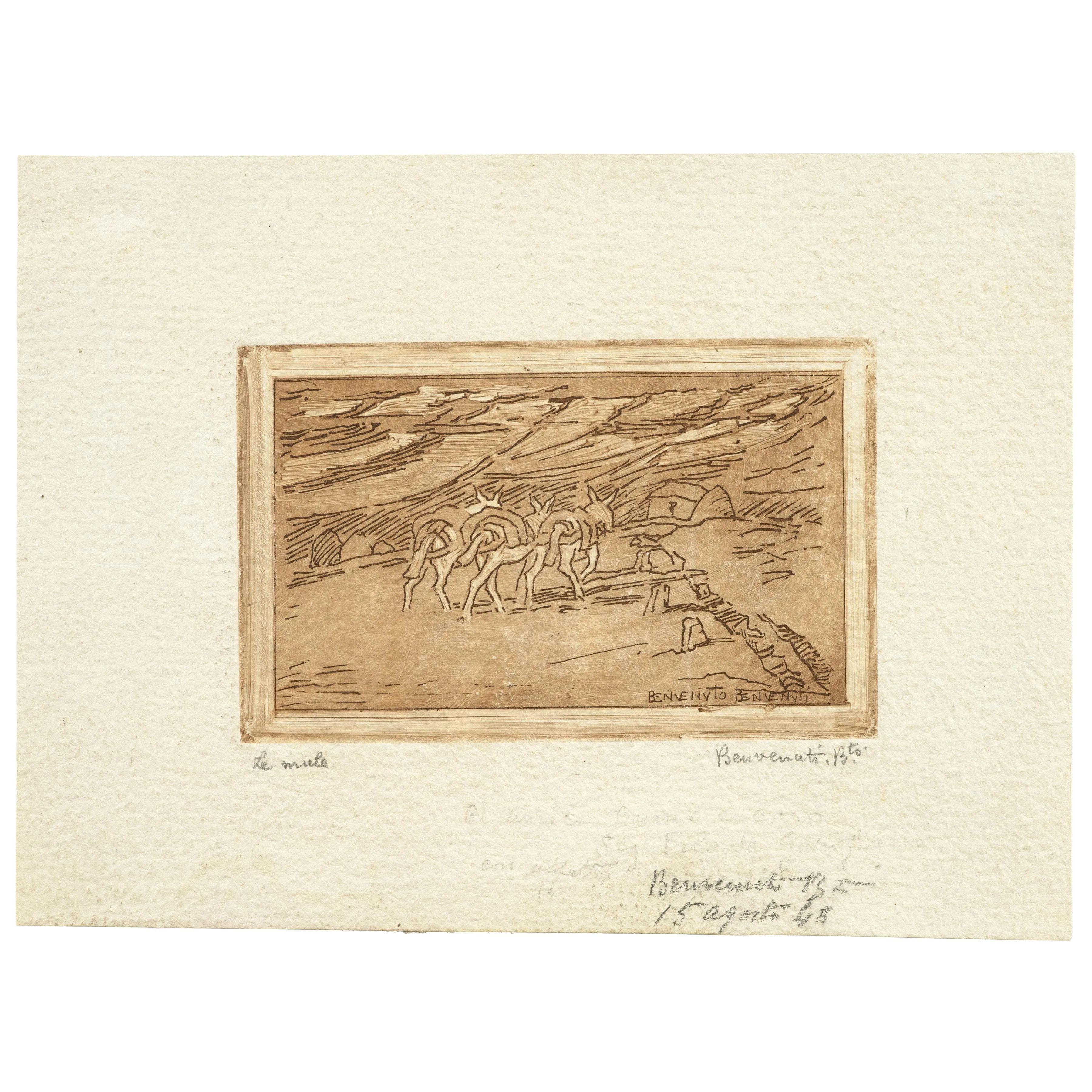 on the recto, lower left, balck chalk: "Le mule"; lower center, black chalk: "Al mio bravo e caro / Sig. [...] / con affetto / Benvenuti B / 15 agosto 45"; lower right, black chalk: "Benvenuti B.to"
