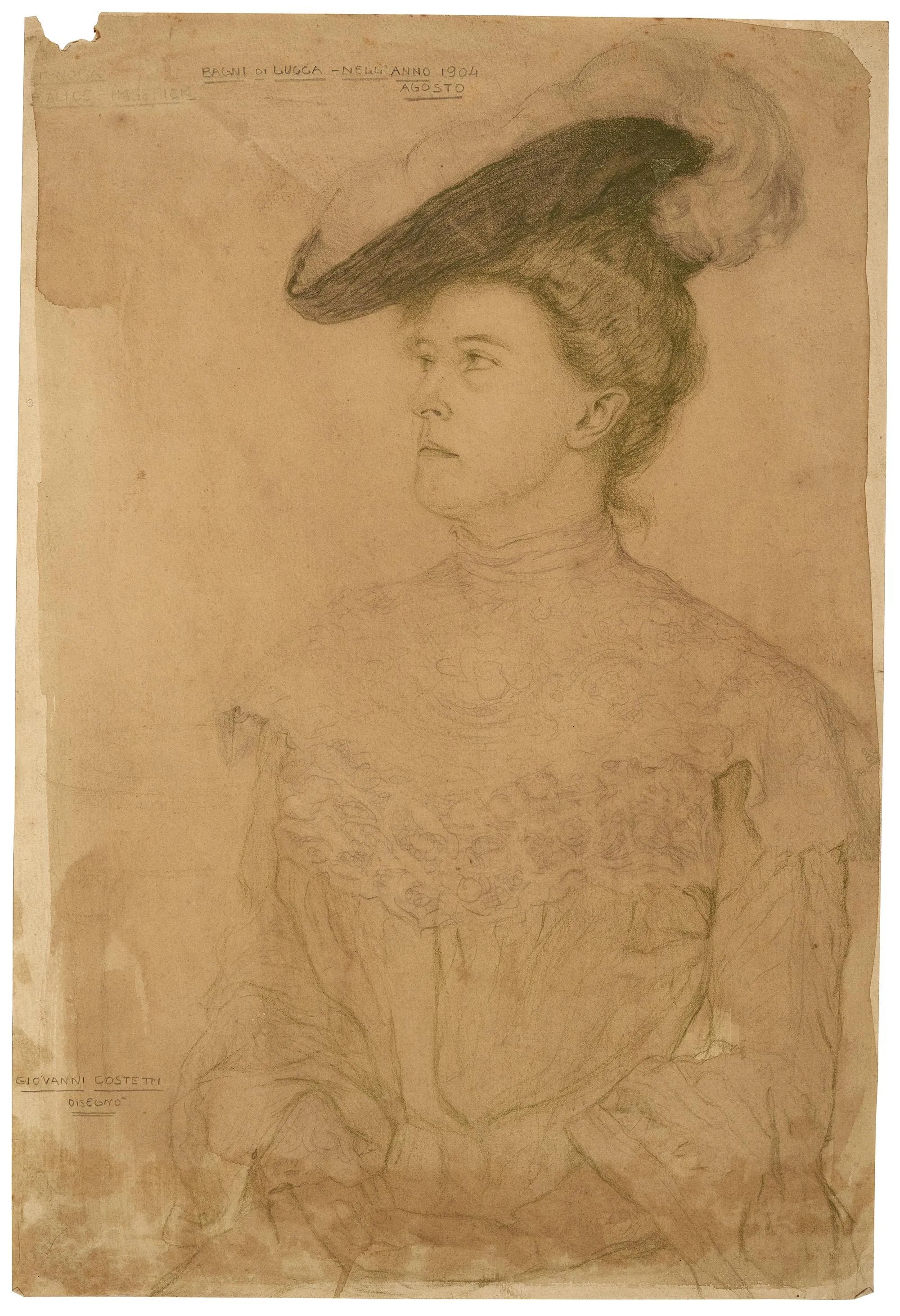 on the recto, upper left, black chalk: "Signora / Alice Hasetick / Bagni di Lucca - nell'anno 1904 / Agosto"; lower left, black chalk: "Giovanni Costetti / disegnò"