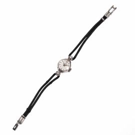 cassa in oro bianco 18kt, fondello a pressione, anse impreziosite da piccoli diamanti entro castone, quadrante argentè, indici applicati, movimento a carica manuale cal AS 1012, cinturino in corda nero con chiusura a scomparsa in metallo, vetro plastica, gr. 10 Diam. mm 15