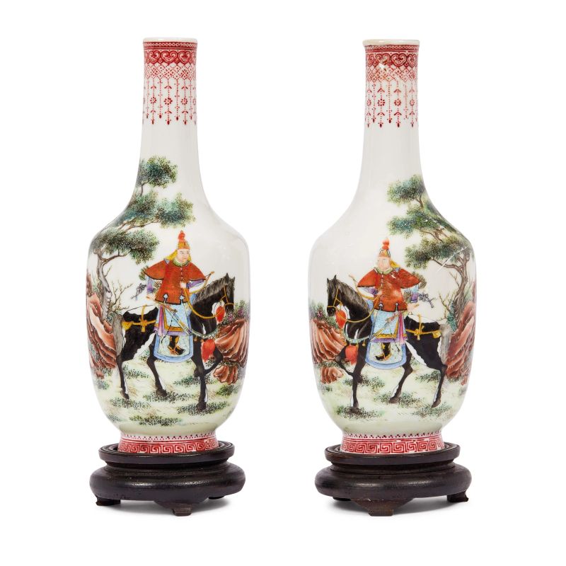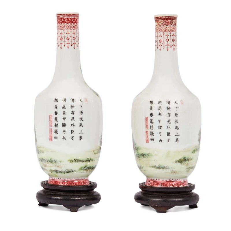 民国 二十世纪 珐琅彩狩猎图长颈瓶一对 高20厘米