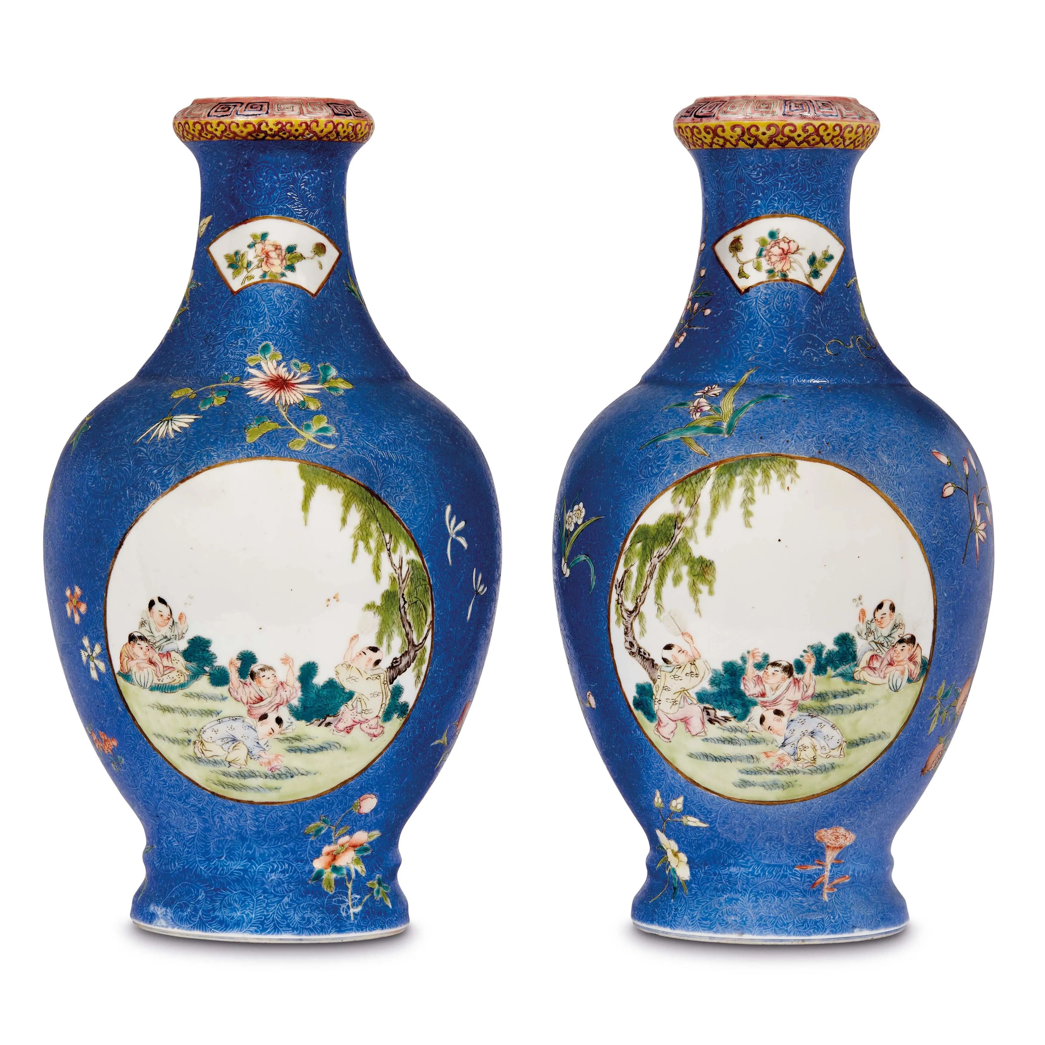 民国 二十世纪 蓝地轧道开光婴戏图瓶一对 高36.5厘米