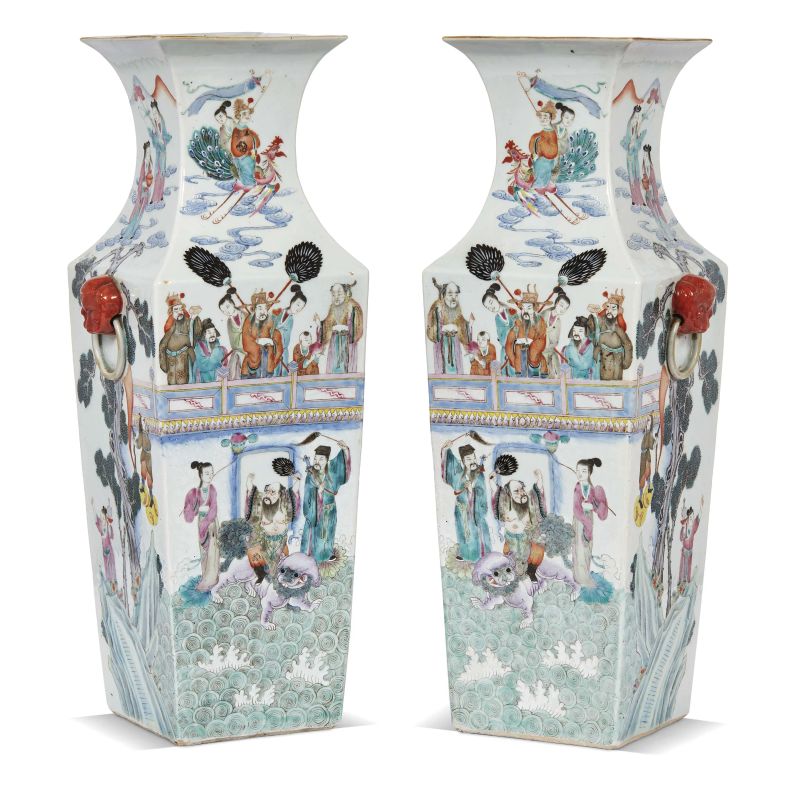 清 十九世纪 粉彩八仙祝寿方瓶一对 高53厘米