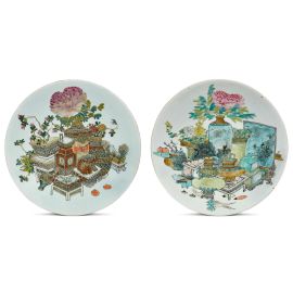 清 十九-二十世纪 粉彩博古图盘一对 直径37.1厘米