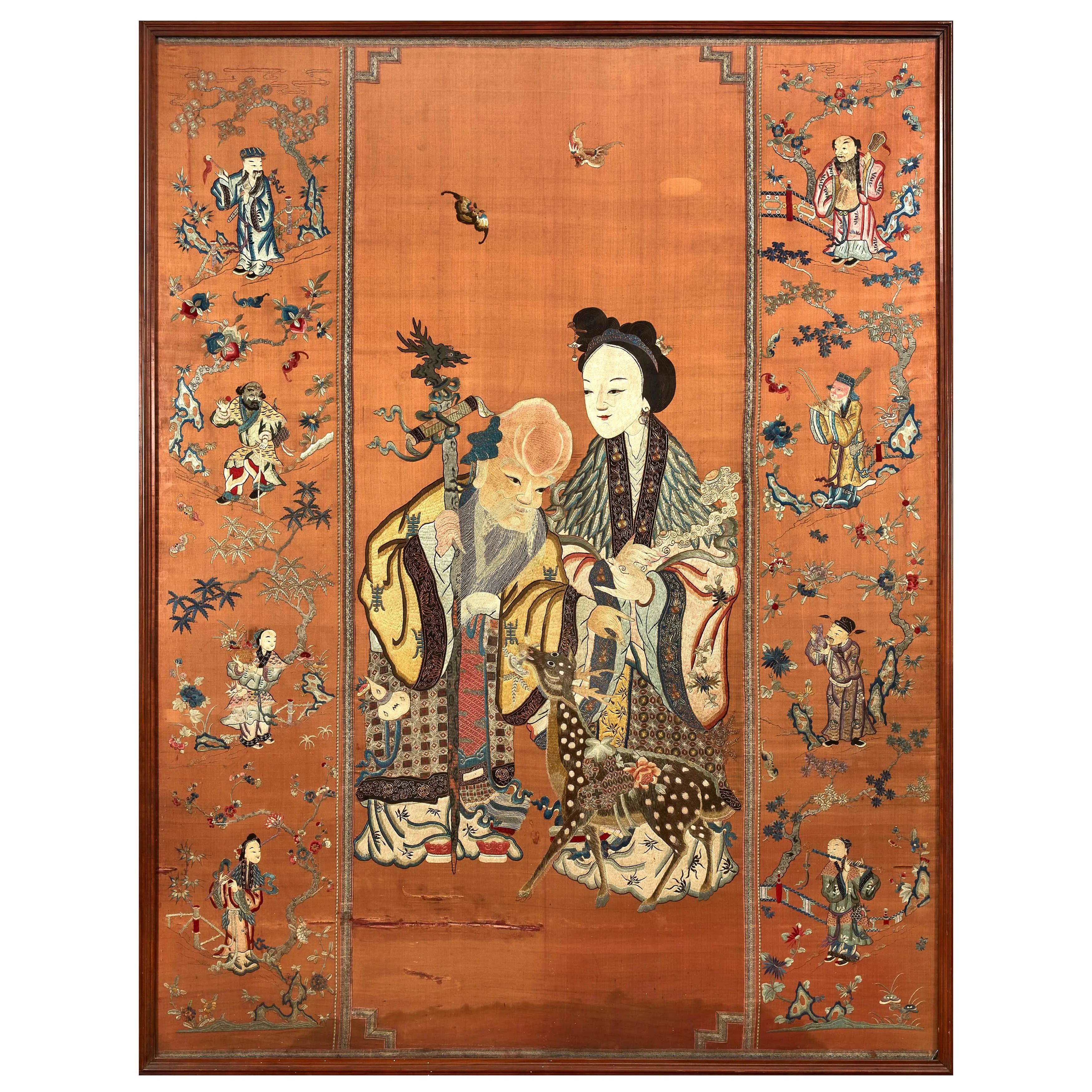 On an orange silk ground, polychrome threads depict Shoulao, the god of longevity, accompanied by a female figure and a deer, with the side borders featuring immortals and figures within a flowering landscape.