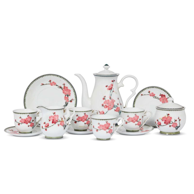 comprising teapot, milk jug, sugar bowl, cups with saucers, and plates decorated with flowering branches. Year 1973.