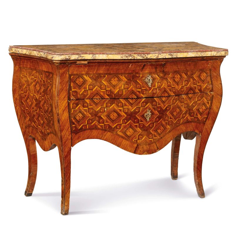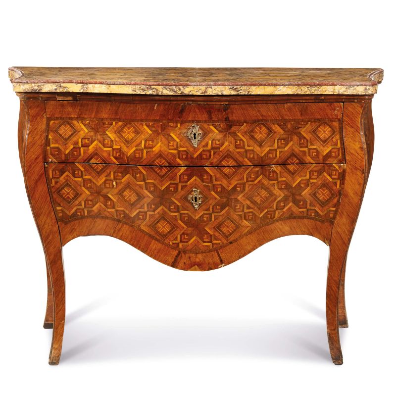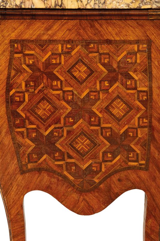 lastronato in legni vari di forma sagomata con piano in marmo, fronte a due cassetti interessato da decoro a tarsie a forte contrasto tra essenze chiare e scure contrapposte a formare un motivo a stelle e losanghe, che si ripete sui fianchi, racchiuso da profilatura in legno scuro; la bordura esterna in legno impiallacciato avvolge fianchi, gambe e grembiale, in una rara soluzione asimmetrica, cm 98x137x65