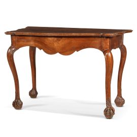 in noce intagliato, piano sagomato e stondato agli angoli, poggiante su sottofascia sagomata a un cassetto centrale e alte gambe di linea sinuosa rastremate su piedi a zampa leonina su sfera, cm 83,5x125,5x71