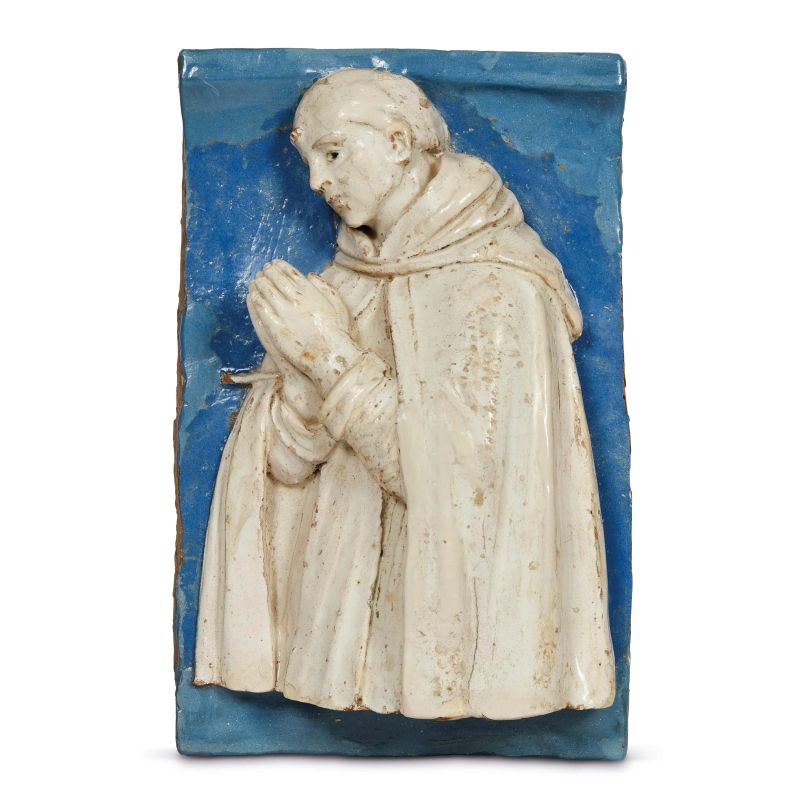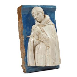 in terracotta invetriata in policromia di forma rettangolare, al centro un santo di profilo in abito monacali in preghiera rivolto verso la propria destra, completamente smaltato di bianco sul fondo azzurro. La formella, che probabilmente ornava la fascia inferiore di una grande pala d'altare, sembra riferibile alla mano di Andrea o Girolamo della Robbia, attivi nella bottega di famiglia a cavallo del 1500; cm 24x15,5x9,5. Montata entro cornice ad edicola moderna di gusto rinascimentale, cm 36x29,2x9,2 complessivamente