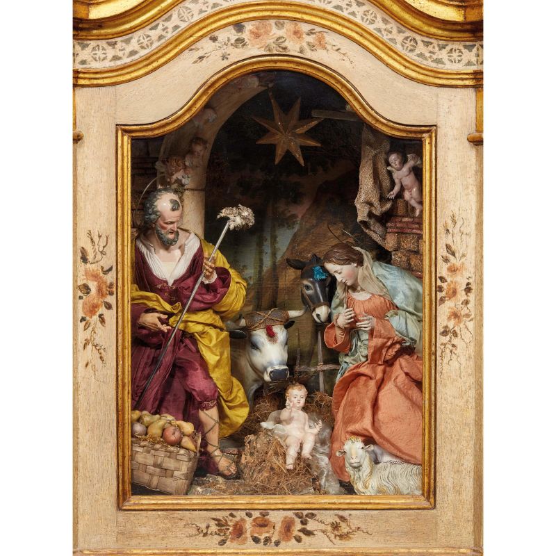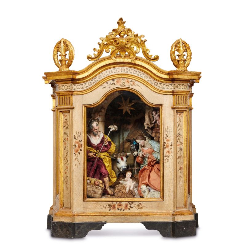 in legno dipinto in policromia, parzialmente dorato e intagliato, cm 130,5x104x60, contentente scena dalla Natività, composta da: Vergine, con testa in terracotta policroma, mani e piedi in legno dipinto, occhi in vetro, manichino in fil di ferro ricoperto di stoppa, abbigliata con veste in seta rosa, svolazzo azzurro e cipria; San Giuseppe, con testa in terracotta policroma, mani e piedi in legno dipinto, occhi in vetro, manichino in fil di ferro ricoperto di stoppa, abbigliato con camicia in seta bianca, giacca e brache in seta amaranto e mantello giallo, tiene in mano un bastone con fiori; Gesù Bambino in terracotta con aureola sul capo; completano la scena il bue e l'asinello in legno dipinto in policromia, una pecora accosciata in terracotta e cinque puttini in terracotta a incorniciare la struttura architettonica; accessori: una cesta di pere e una cesta di limoni