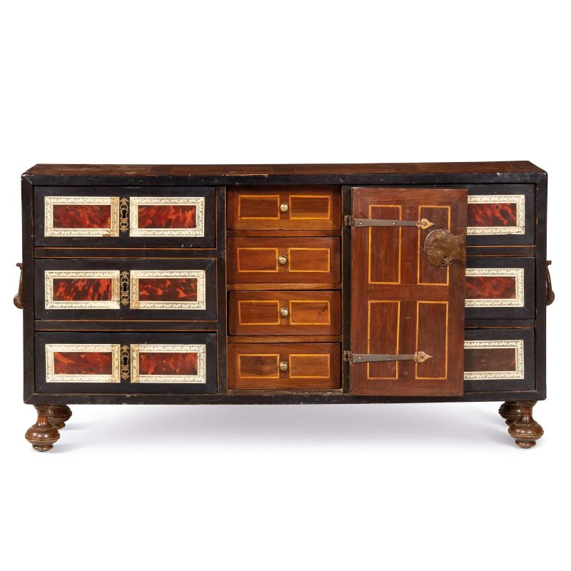 in mogano e osso, fronte a sei cassetti e uno sportello con decorazione architettonica a simulare un grande portale a due ordini, celante quattro cassettini verticali, affiancato da doppi cassetti disposti su tre file, sorretto da piedi a trottola, cm 51x95x26