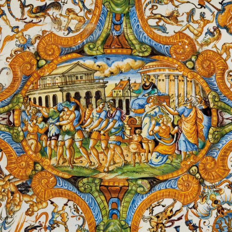 La questione di questi vassoi, tanto importanti e appariscenti al punto da essere tra le maioliche a “raffaellesche” raccolte dal Cardinal Mazzarino, come ci ricorda lo stesso Leprince nel suo saggio, non pare del tutto esaurita: restano infatti da riconoscere le personalità pittoriche attive nella manifattura, dove, come ben dimostra il nostro bacile, emergono caratteristiche stilistiche che vedono l’apporto di mani differenti, come ad esempio le nuvole a spirale, le grottesche o le figure dipinte al verso dei piatti. Si tratta comunque di opere importanti prodotte da una bottega ormai definita che, pur mantenendo le caratteristiche peculiari delle opere di ispirazione urbinate, se ne distacca per maniera e materia.