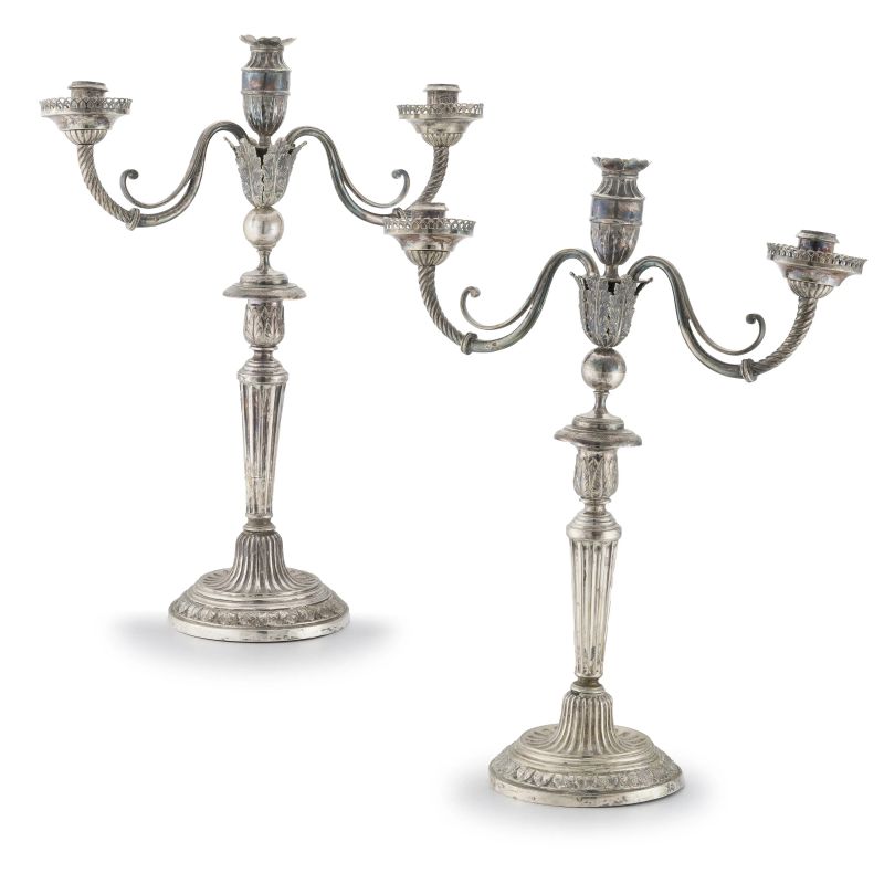in argento, basi circolari decorate da foglie, fusti scanalati su cui poggiano due bracci a volute, complessive tre luci, alt. cm 42, complessivi g 2140