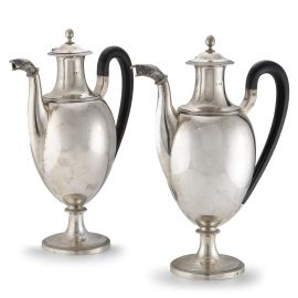 in argento, corpi ovoidali su basi circolari con monogramma CFB, beccuccio con finale a forma di testa d’aquila e presa del coperchio a pigna, alt. cm 36, complessivi g 2355