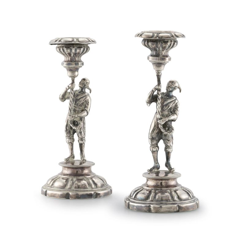 in argento, fusti realizzati come moretti che sostengono una cornucopia terminante a bobeches, basi appesantite, alt. cm 17 e cm 16,5, complessivi g 430 lordi
