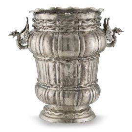 in argento, corpo sagomato e scanalato, due grandi anse realizzate in forma di animali fantastici alati, alt. cm 33,5, g 2250