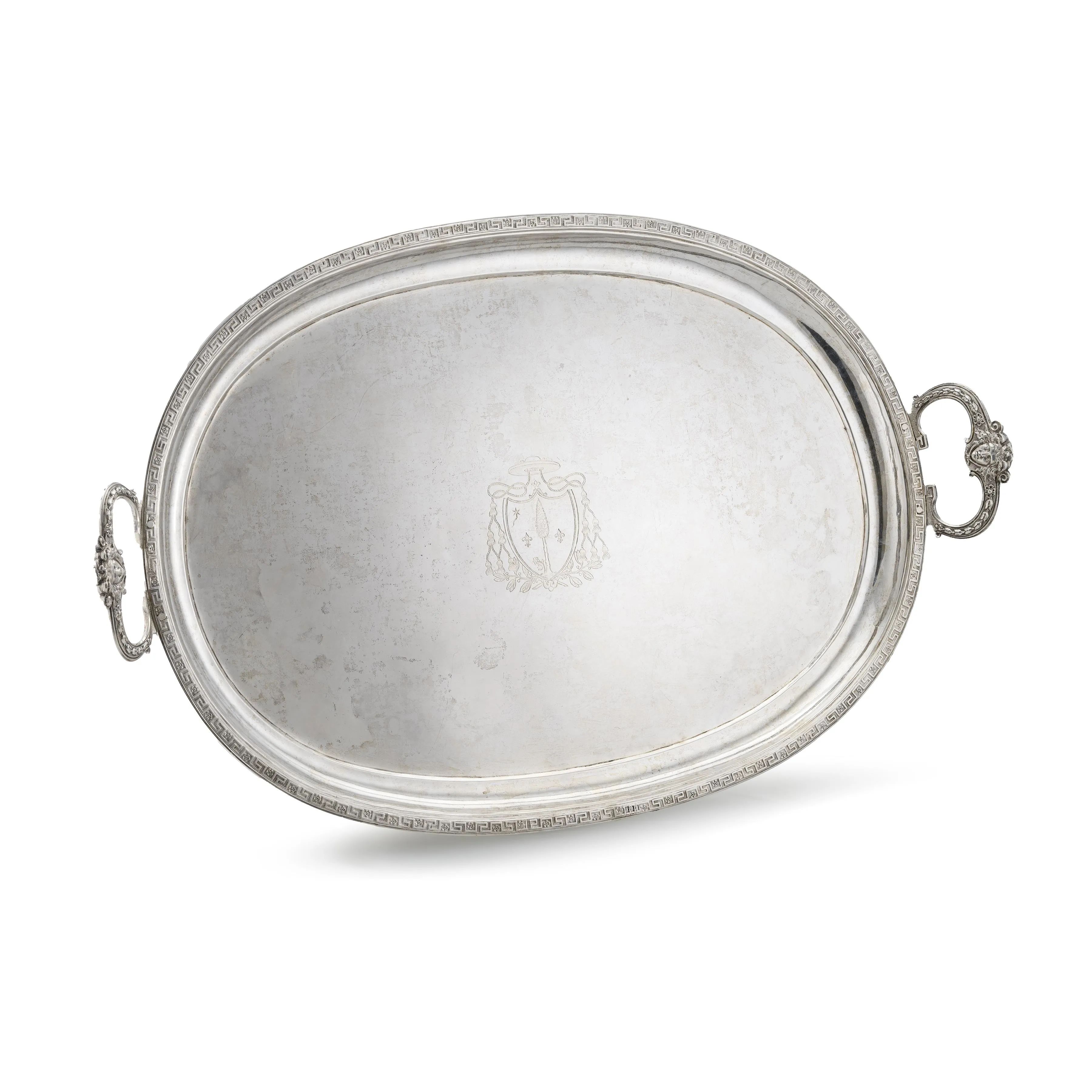 di forma ovale con bordo a greca, al centro stemma della famiglia Pecci con galero cardinalizio, due anse a volute riunite da mascherone, cm 68x42, g 2780