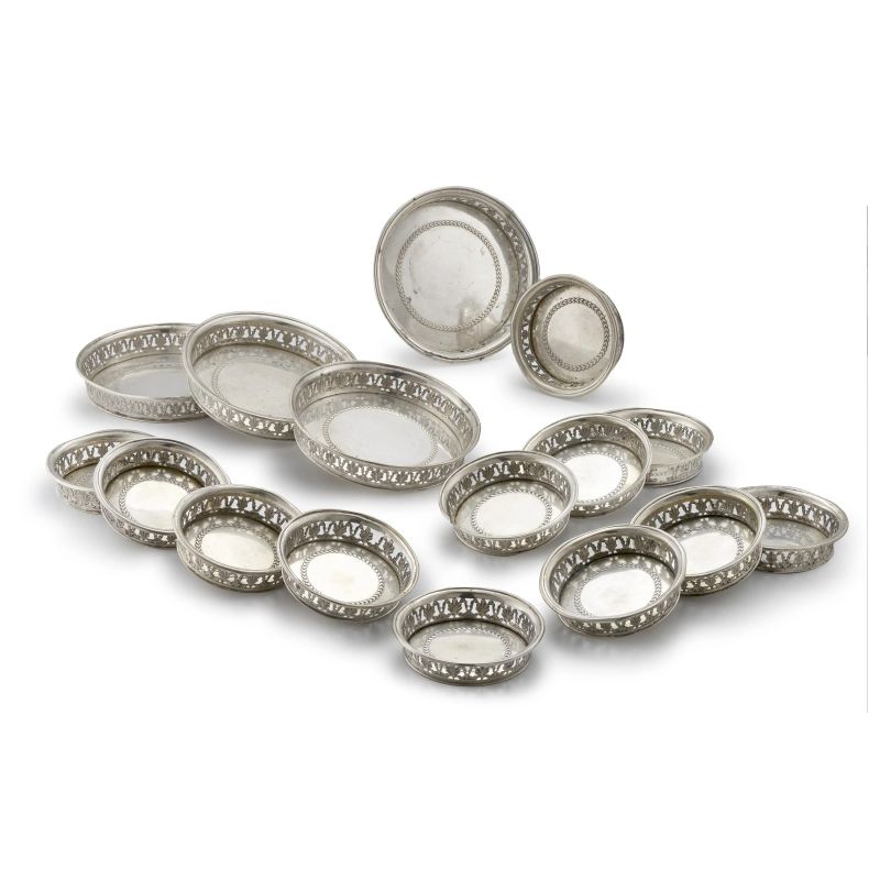 FOUR SILVER BOTTLE COASTERS AND TWELE SILVER GLASS COASTERS, MILAN, 19TH CENTURY, MARK OF PIETRO BIAZZI