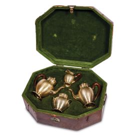 in argento dorato in parte guilloché con decoro puntinato, prese dei coperchi a bocciolo, manici in legno, composto di teiera, caffettiera, zuccheriera e lattiera, complessivi g 1520 entro scatola originale
