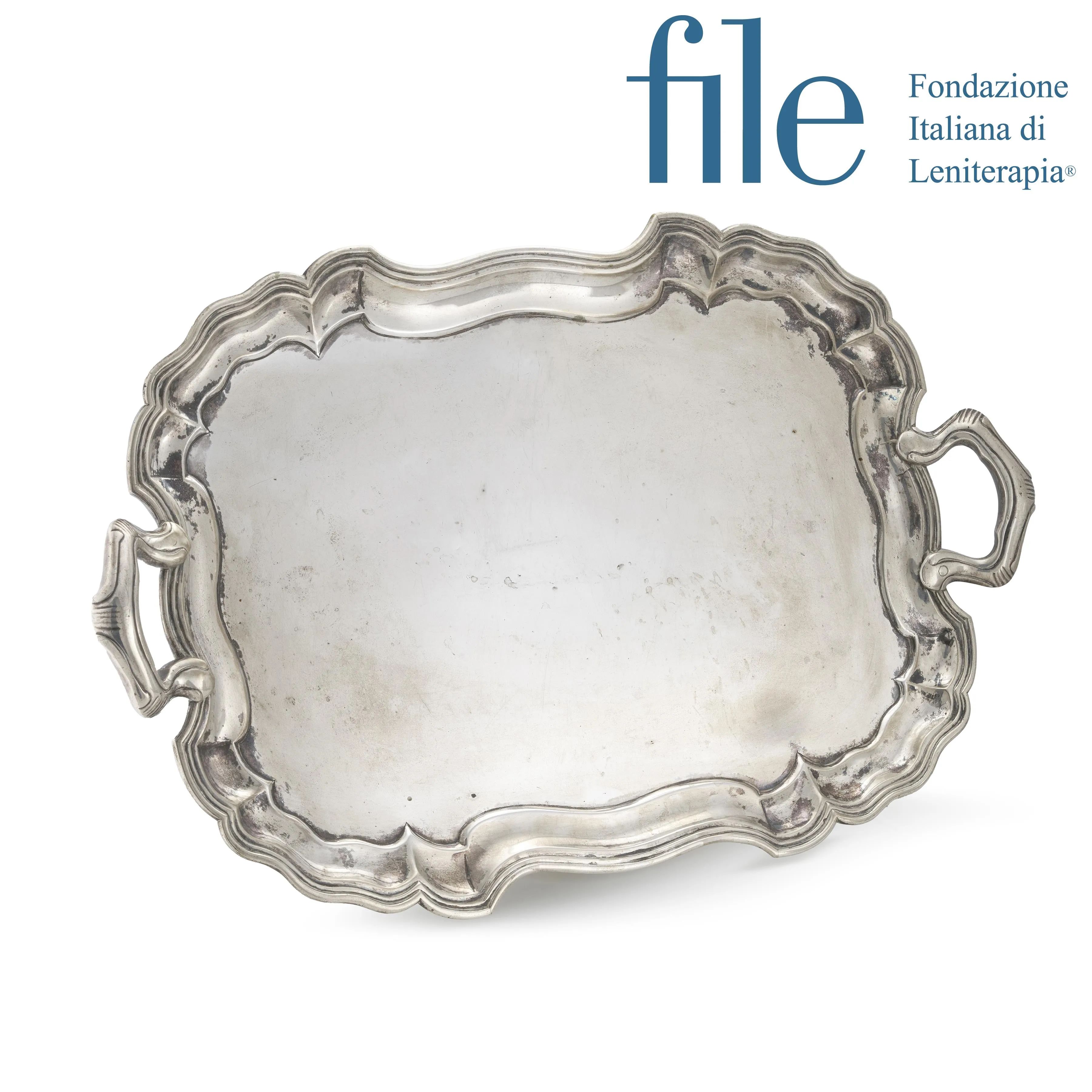 in argento a due anse, bordo sagomato, cm 51X31,5, g 1275