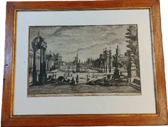 Ferdinando Galli da Bibbiena, coppia di incisioni raffiguranti vedute archietettoniche fantastiche di Porto Reale e di Palazzo Reale, entro cornice