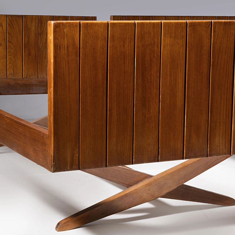 A COUPLE OF WOODEN BEDS WITH SIDEBEDS TABLES