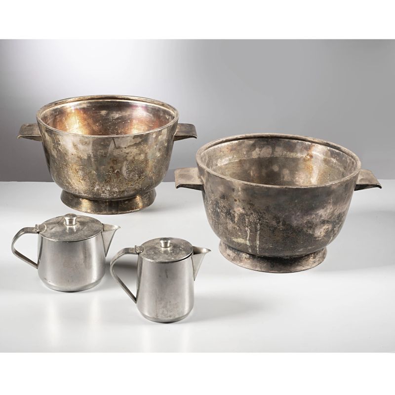 TWO CONTAINERS AND TWO MILK POTS IN NICKEL SILVER