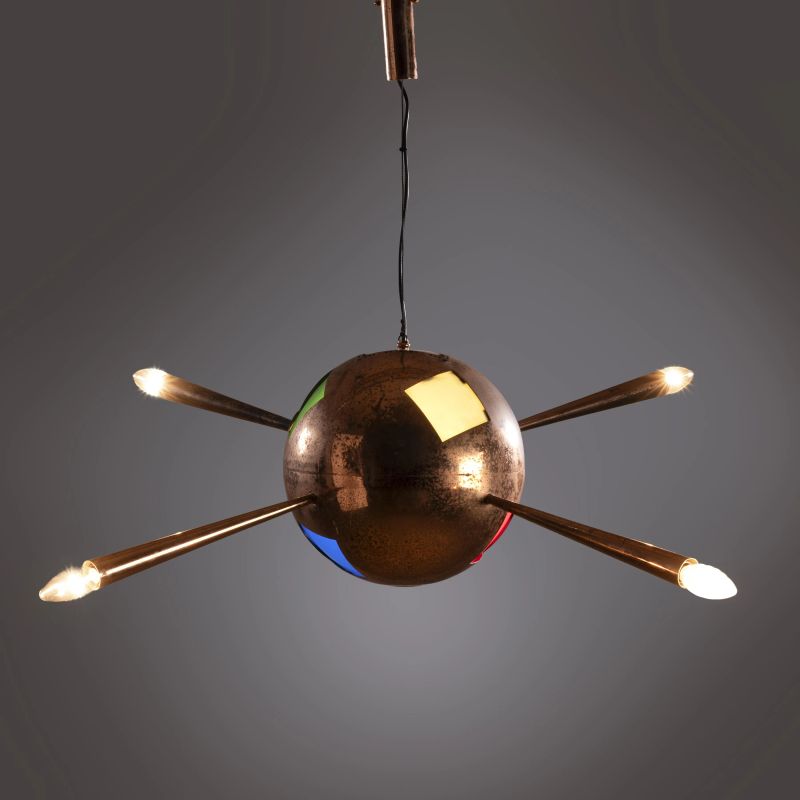 BRASS, COPPER, COLOURED GLASS CEILING LAMP