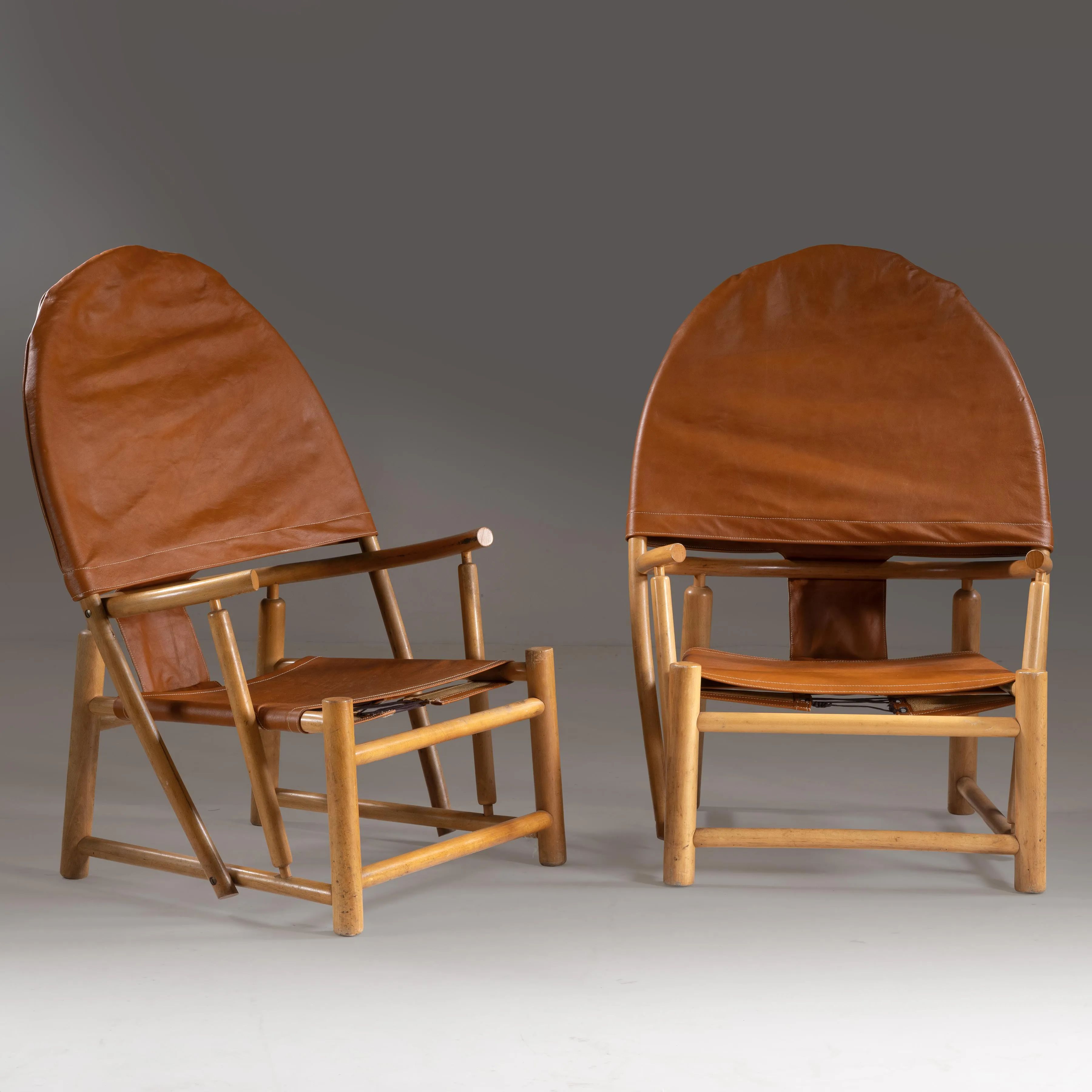 A COUPLE HOOP G23 OF ARMCHAIRS, WOODEN STRUCTURE, BROWN LEATHER UPHOLSTERED SEAT