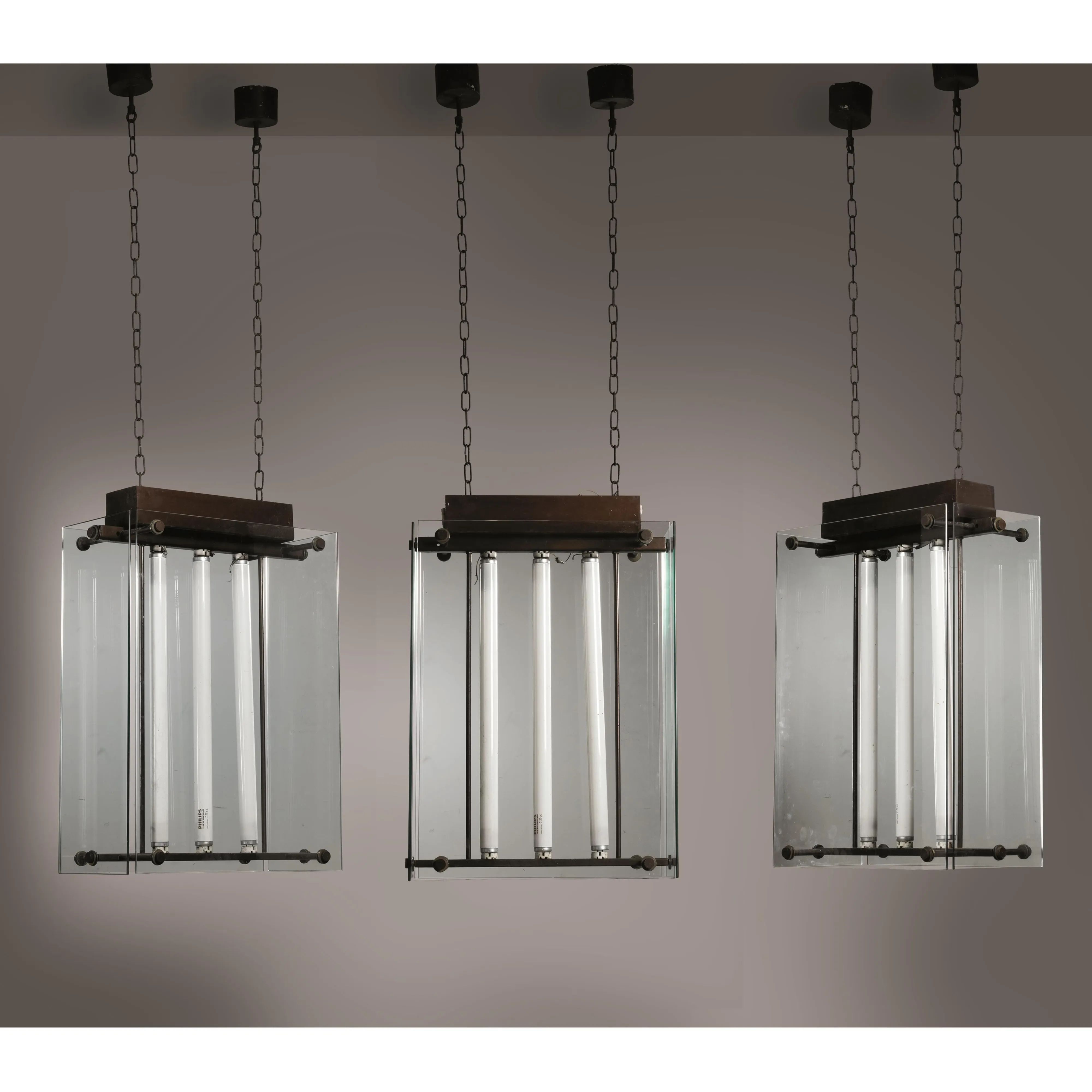 THREE BIG LANTERNS, METAL STRUCTURE, GLASS LAMPSHADE
