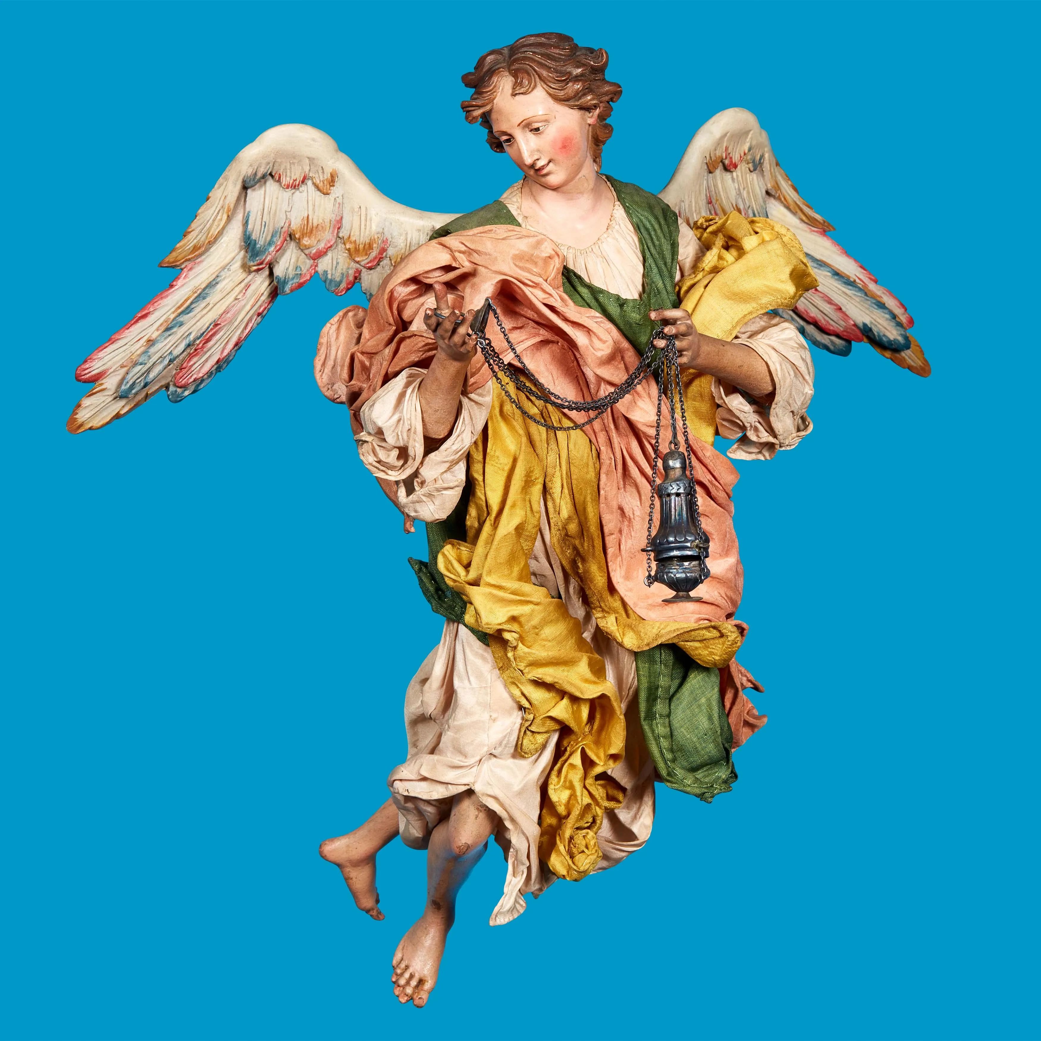 Testa in terracotta policroma, mani e piedi in legno dipinto, occhi in vetro, manichino in fil di ferro ricoperto di stoppa e ali in legno policromo, abbigliato con veste in seta beige, tunica in seta verde e due svolazzi, uno giallo e uno rosa, alt. cm 42; accessori: turibolo