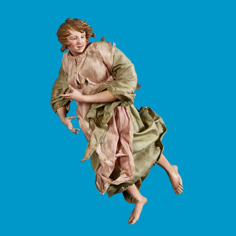 Testa in terracotta policroma, mani e piedi in legno dipinto, occhi in vetro, manichino in fil di ferro ricoperto di stoppa e ali in legno policromo, abbigliato con veste in seta verde e tunica in seta rosa, alt. cm 39