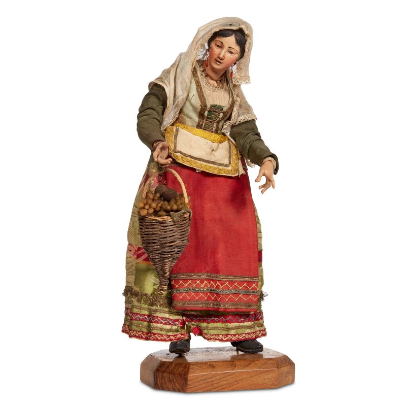 Testa in terracotta policroma, mani e piedi in legno dipinto, occhi in vetro, manichino in fil di ferro ricoperto di stoppa, abbigliata con camicia bianca, corpetto verde chiaro con maniche di verde più scuro, gonna in seta damascata verde e rossa con bordo ricamato, in vita grembiule in armesino rosso con risvolto crema e passamaneria dorata, sulla testa un fazzoletto dall'orlo ricamato, alt. cm 30; accessori: orecchini in corallo, collana con pendente, cesto d'uva