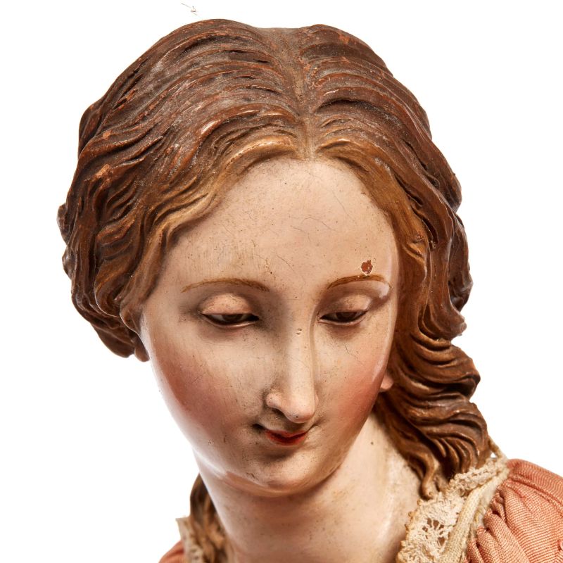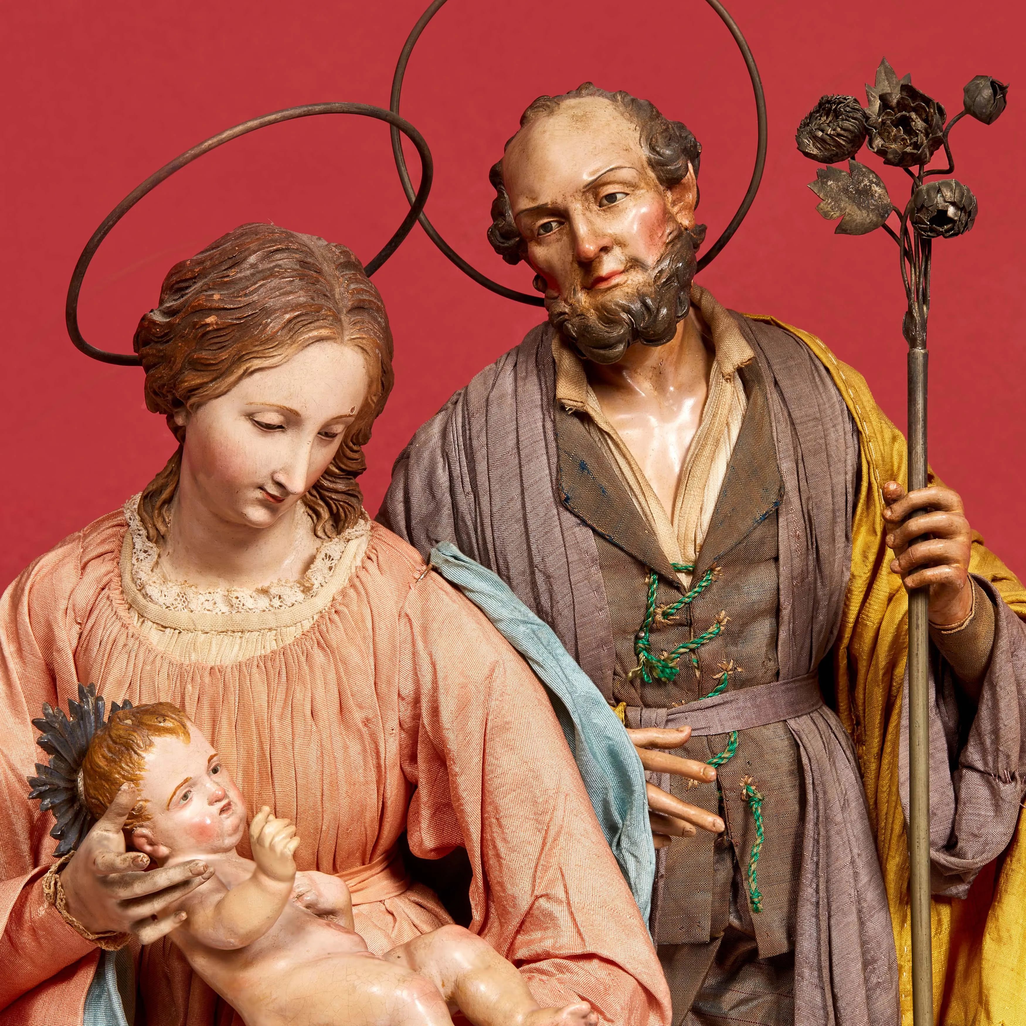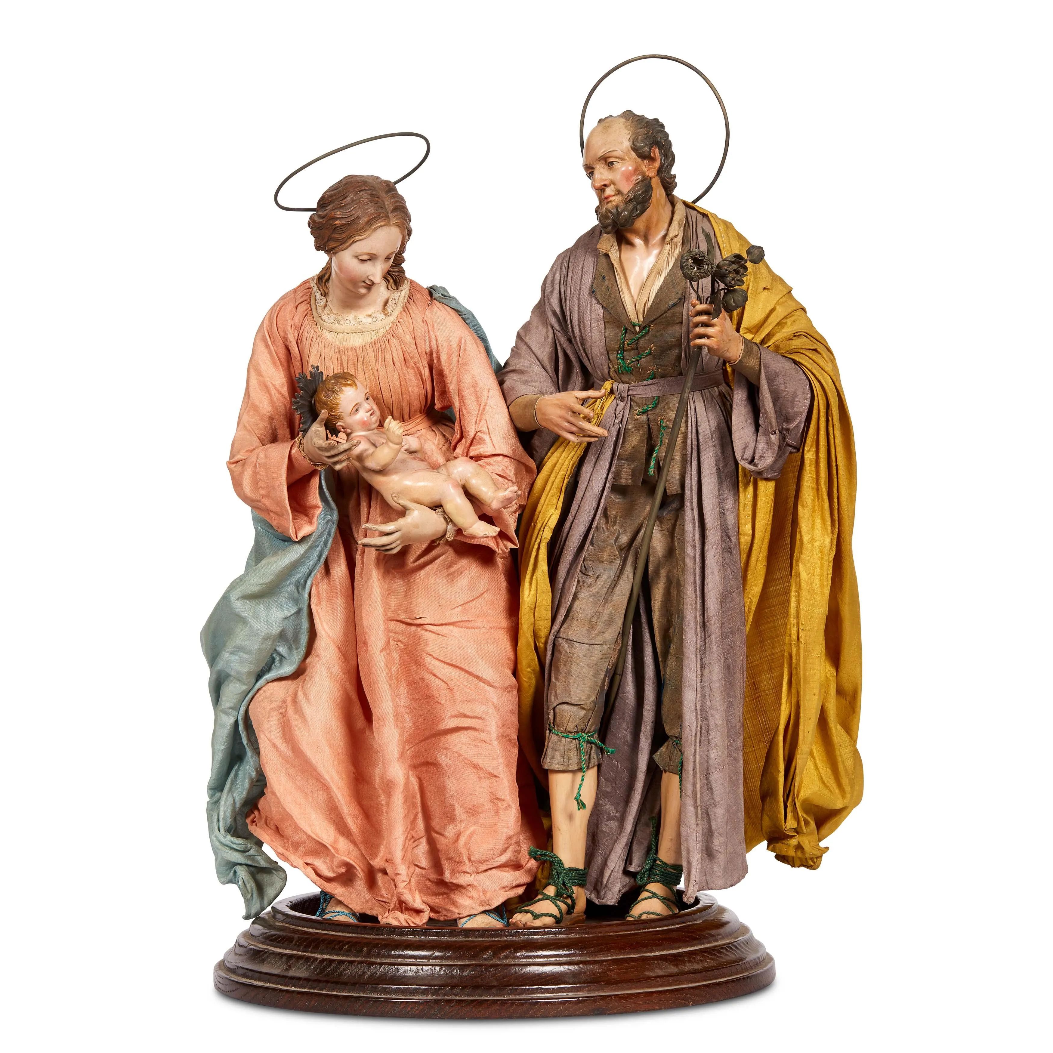 Teste in terracotta policroma, mani e piedi in legno dipinto, occhi in vetro, manichino in fil di ferro ricoperto di stoppa. Composto da: Madonna, abbigliata con sottoveste beige, abito rosa e svolazzo azzurro, ai piedi sandali, aureola in metallo, alt. cm 39,5; San Giuseppe, abbigliato con camicia bianca, giacca e pantaloni in seta marrone, cappotto lungo in seta marrone, e mantello in seta gialla, ai piedi sandali e nella mano sinistra impugna un bastone con fiori in argento, aureola in metallo, alt. cm 41; Gesù Bambino in terracotta policroma con aureola in argento, alt. cm 11,5