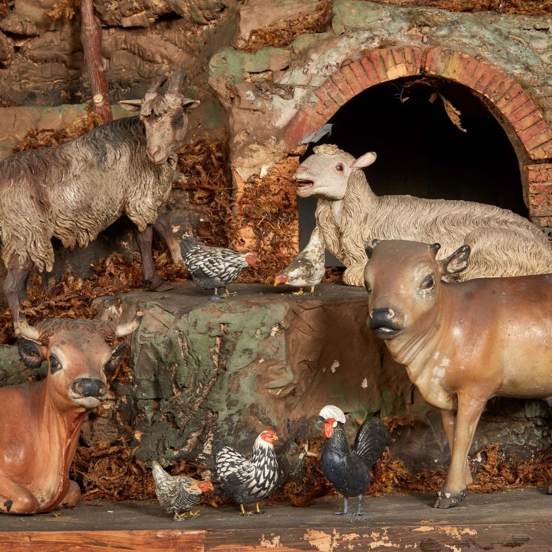 in legno lastronato e vetro con scenografia raffigurante paesaggio roccioso in sughero e legno e numerosi animali in terracotta policroma, cm 107x108x60 complessivamente. Composizione: due mucche accosciate e una stante, una pecora dormiente, una accosciata e due stanti, due capre accosciate, una rampante e una stante, un gallo e sette galline