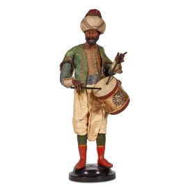 Testa in terracotta policroma, mani e piedi in legno dipinto, occhi in vetro, manichino in fil di ferro ricoperto di stoppa, abbigliata con camicia in seta beige operata in oro e maniche blu, giacca in broccato verde gallonata in oro, pantaloni all'orientale beige cinti in vita da fusciacca, sulla testa porta un turbante, alt. cm 41,5; accessori: tamburo e bacchette